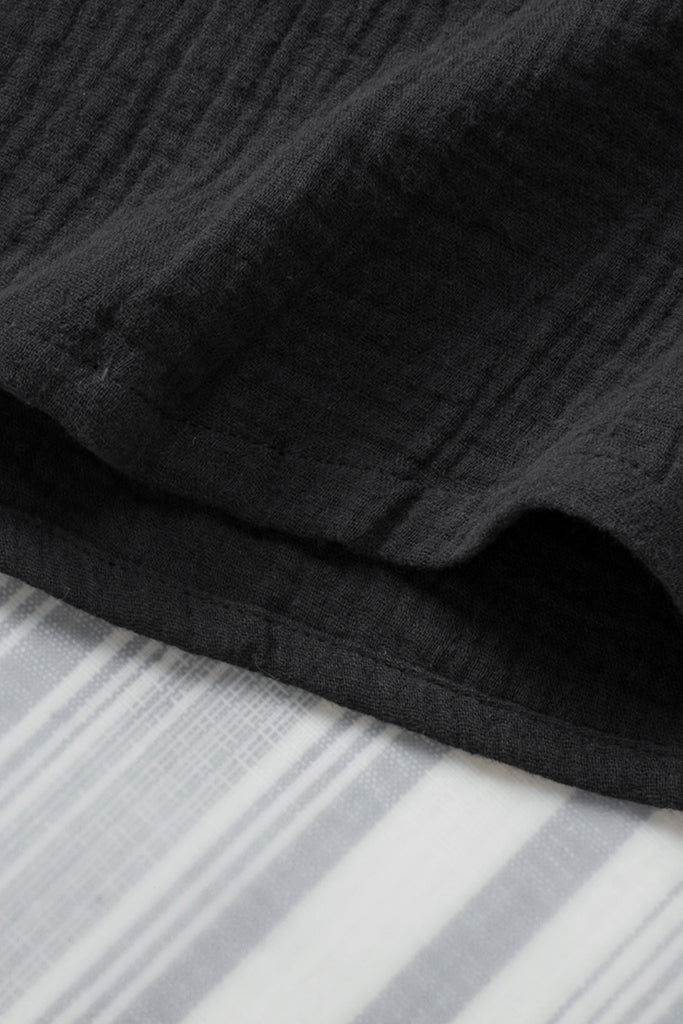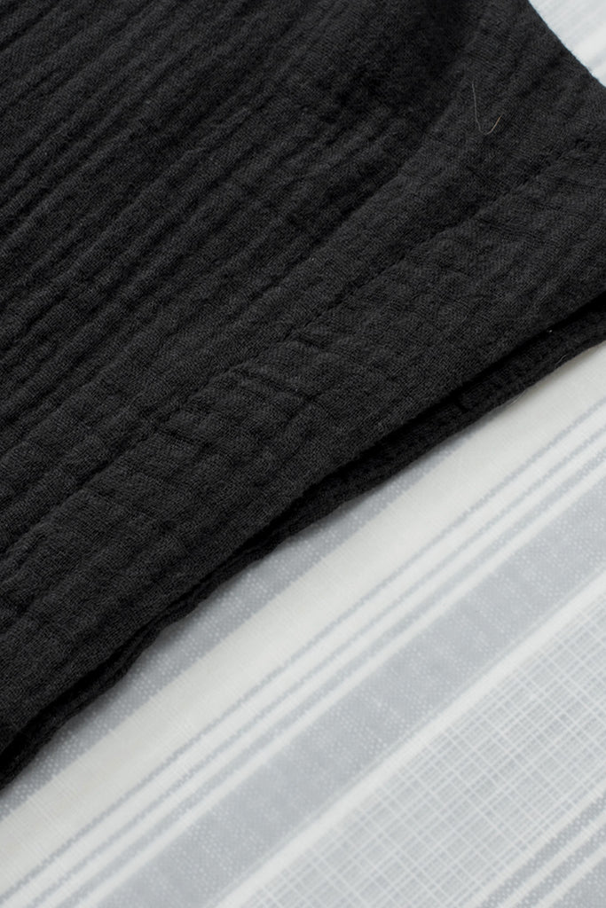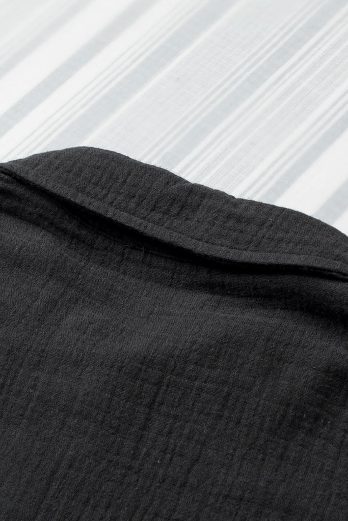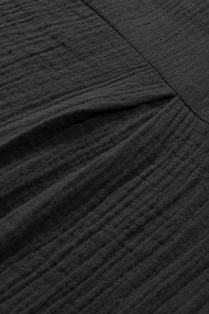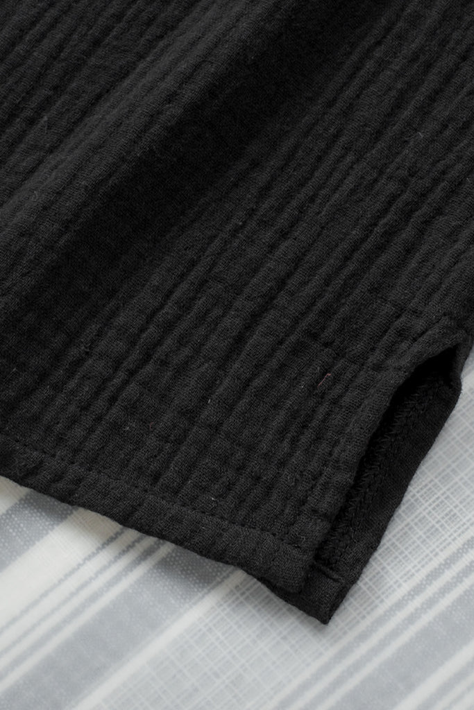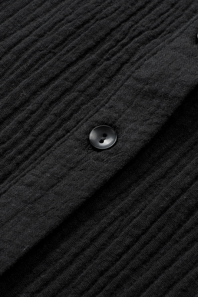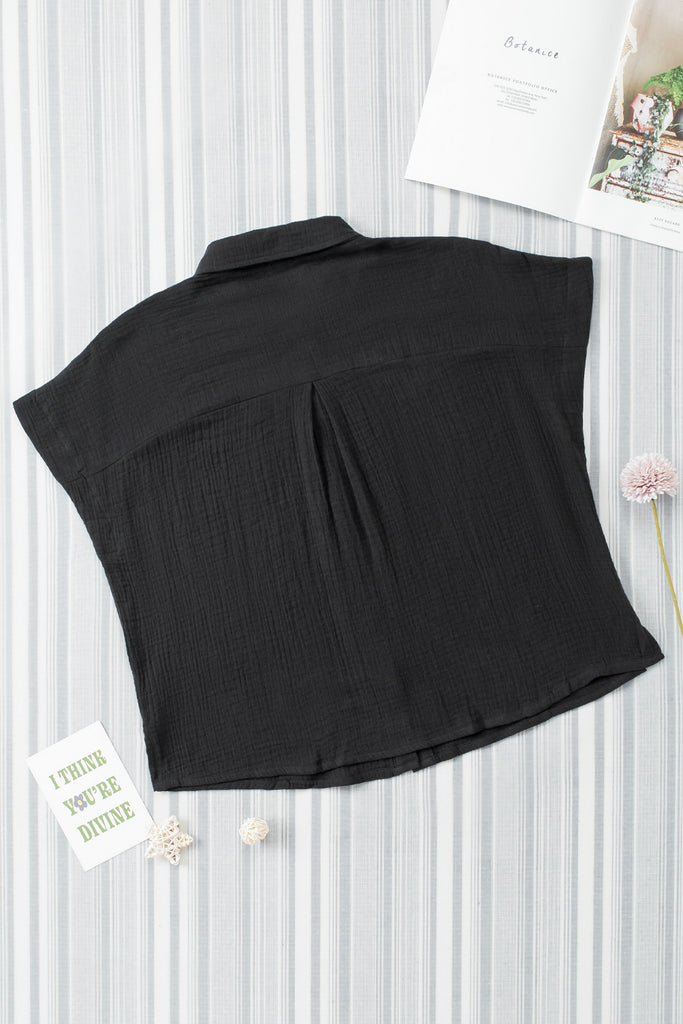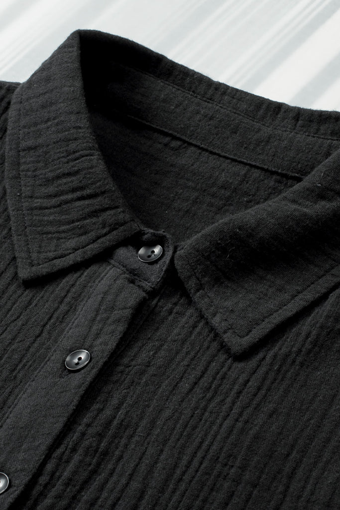 Embrace relaxed sophistication with the Textured Muse Button-Front Shirt. Crafted from lightweight, crinkled cotton in deep black (also available in rich berry), this collared top features short dolman sleeves, a front button placket, subtle pleat detail at the back yoke, and a breezy high-low hem. Effortlessly chic for everyday wear or layered looks. Material: 100% Cotton