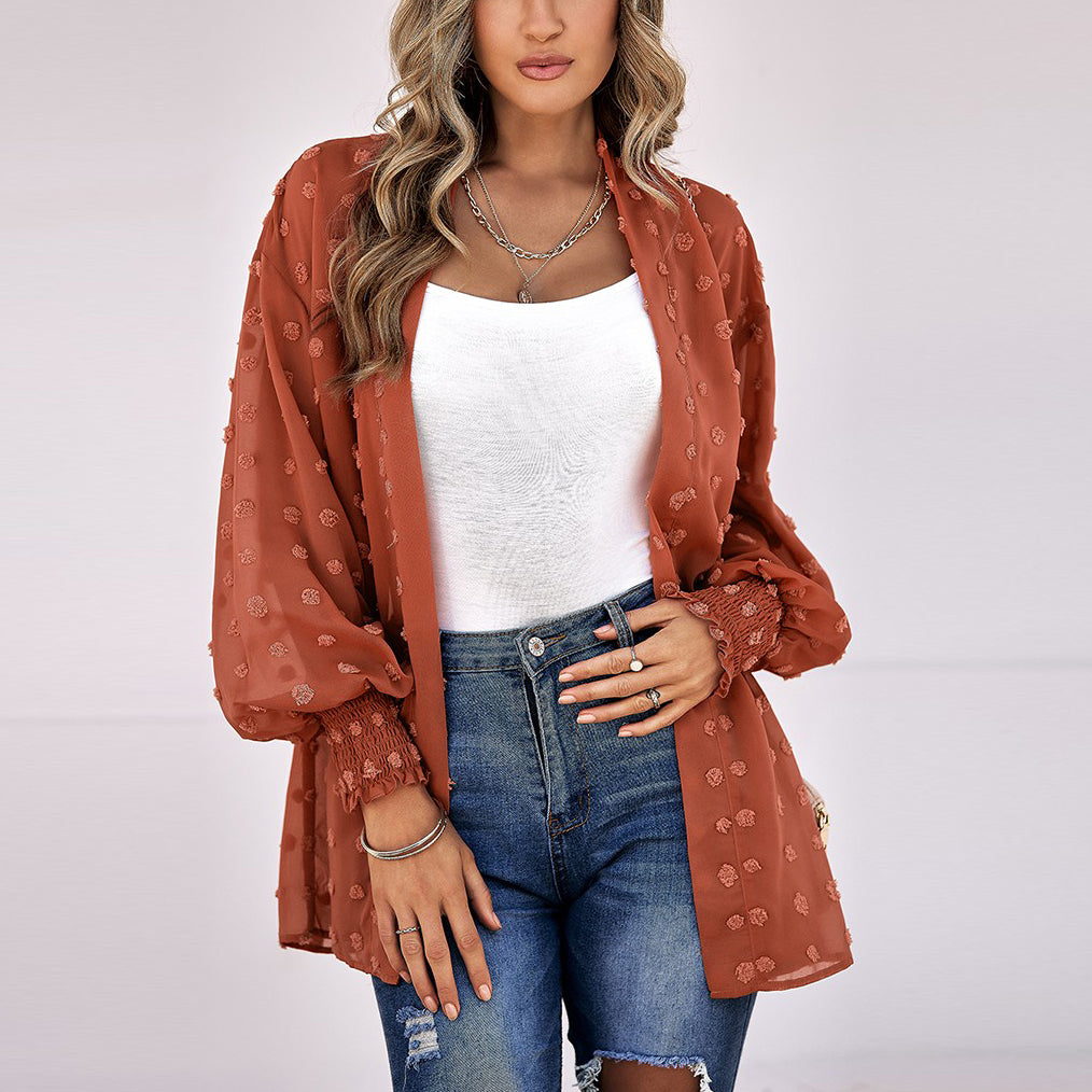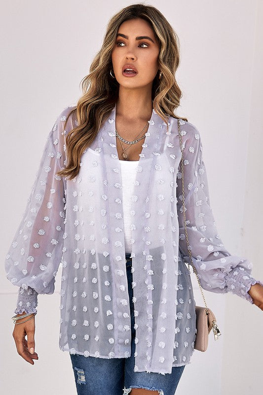Light and breezy, the Airy Grace Wrap is your go-to for casual elegance. This over-hip length cardigan, with its smocked cuffs and dotted texture, offers both comfort and style.