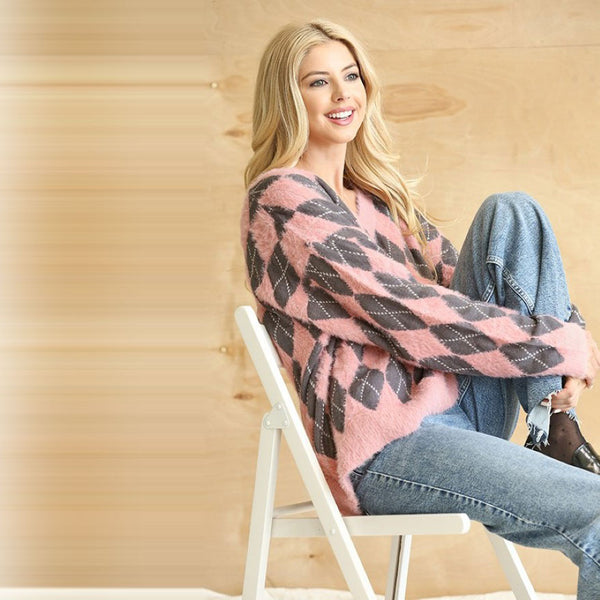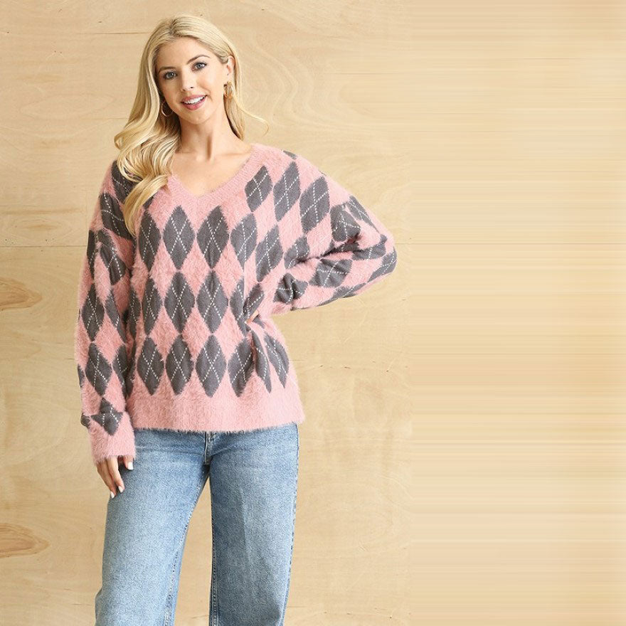 This soft and comfy Vneck sweater features a plush texture and a classic argyle plaid design that you can wear up and down with.
