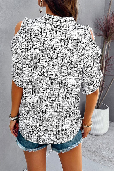 Indulge in artistic allure with our Artistic Edge Open Shoulder Blouse. Featuring a V-neck and open shoulders, adorned with ruffled edges on the sleeves. Crafted from allover abstract strokes print woven fabric, it offers a relaxed fit and a stylish round hem
