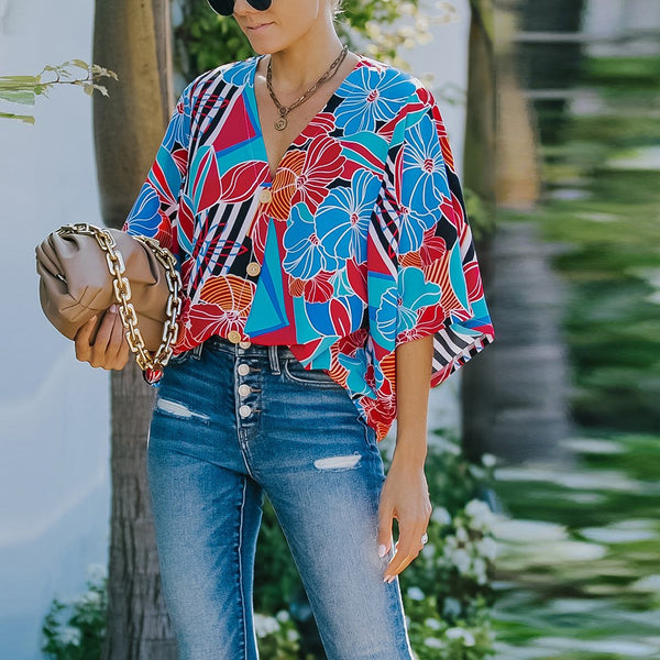 Introducing our Blossom Breeze Kimono Blouse, a delightful fusion of playful florals and charming stripes. With a graceful V-neck and button front, this blouse boasts short kimono sleeves and a relaxed drop-shoulder fit for effortless elegance. Crafted with a pleated back detail and woven fabric, it exudes a whimsical charm that's perfect for any occasion.