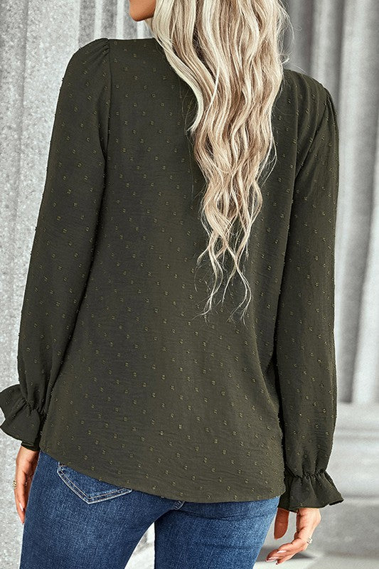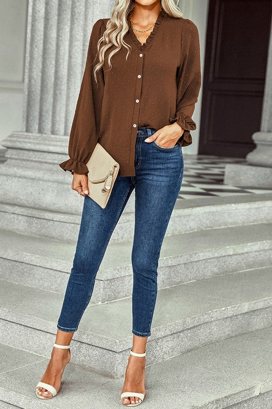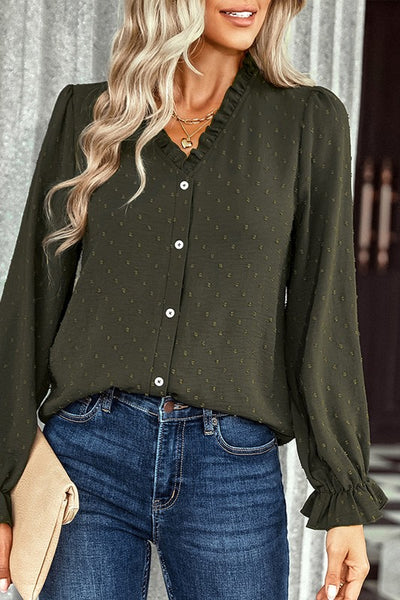 Introducing our Dotted Vneck Ruffled Sleeves Blouse - a charming addition to your wardrobe. This blouse boasts a flattering V-neck adorned with delicate ruffles, exuding a touch of elegance. Its long sleeves feature elastic cuffs for both comfort and style. The button front adds a classic touch, and the round hem and relax fit provide a casual yet chic look. With its hip-length design and dotted textured woven fabric, this blouse is perfect for any occasion, whether it's a day at the office or a casual evening out. Elevate your style with this versatile and sophisticated blouse.
