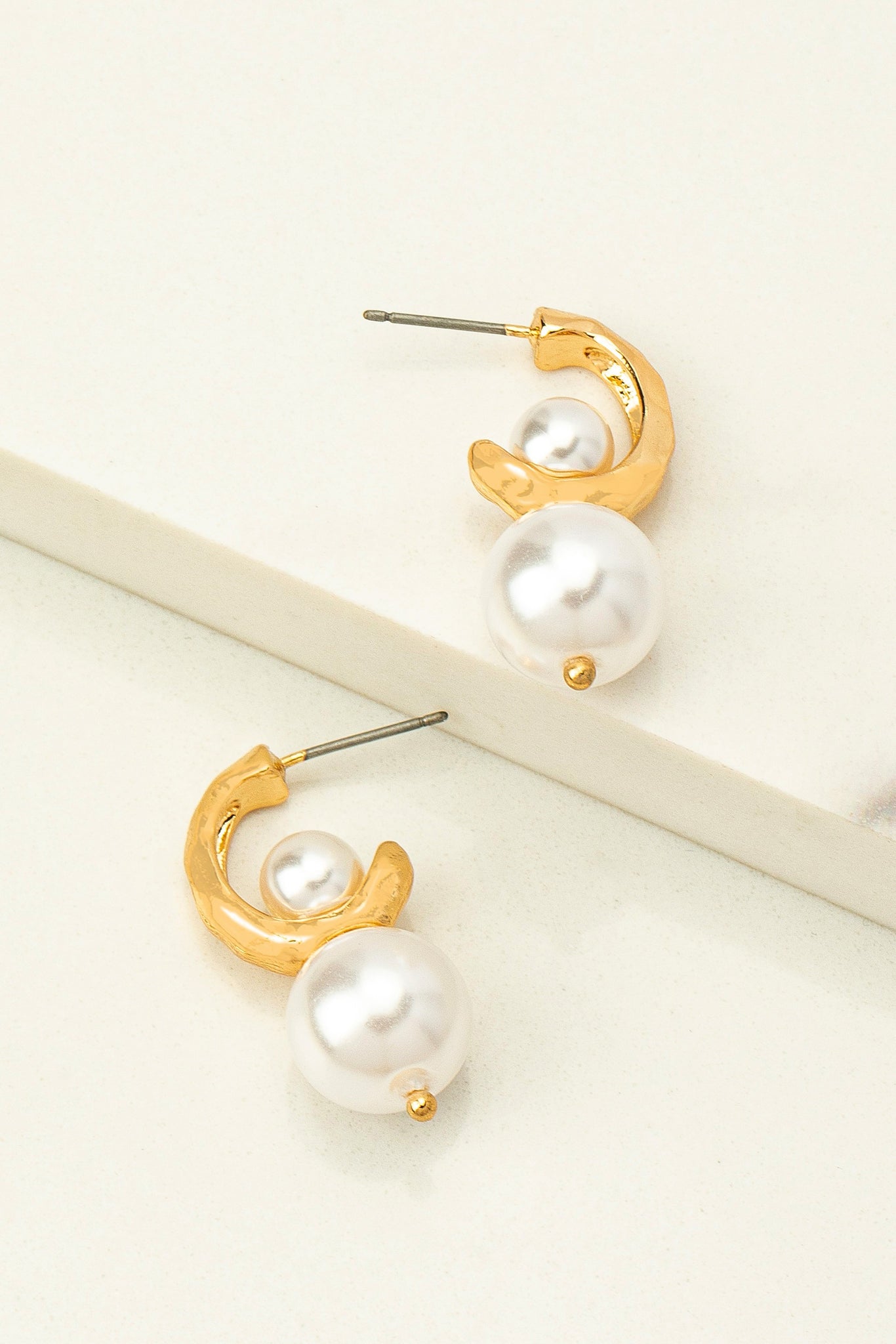 Enhance your elegance with these gold hammered huggie hoop earrings featuring two pearls. The combination of textured gold and classic pearls creates a sophisticated look that's perfect for any occasion.