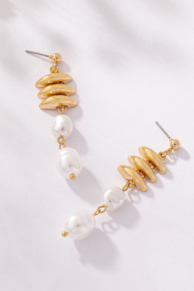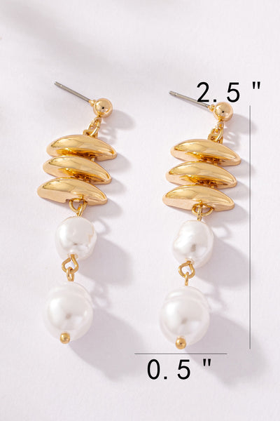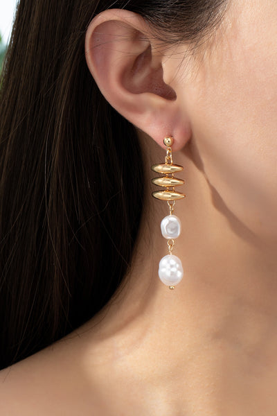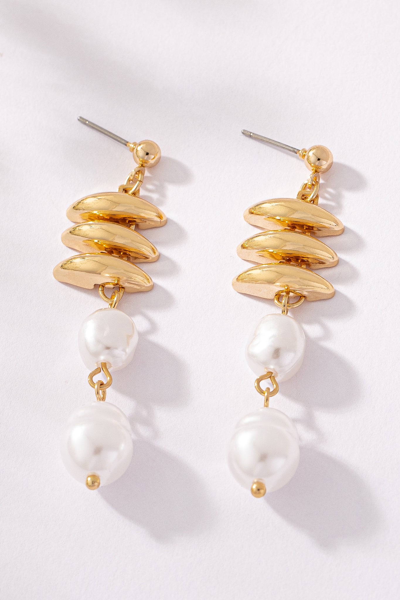 Hollow golden beads paired with pearls in a sleek linear design create these stunning post back drop earrings for timeless elegance.