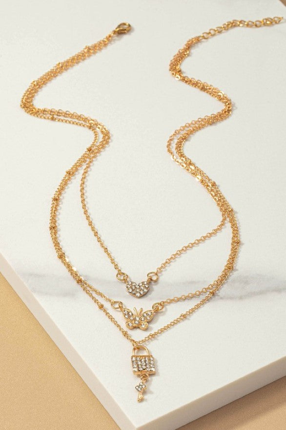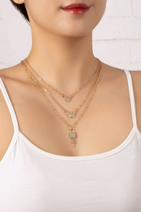 Incluye un collar con colgante de corazón en tono dorado, un collar con colgante de mariposa en tono dorado y un collar con colgante de llave y candado en tono dorado (tres piezas en total)