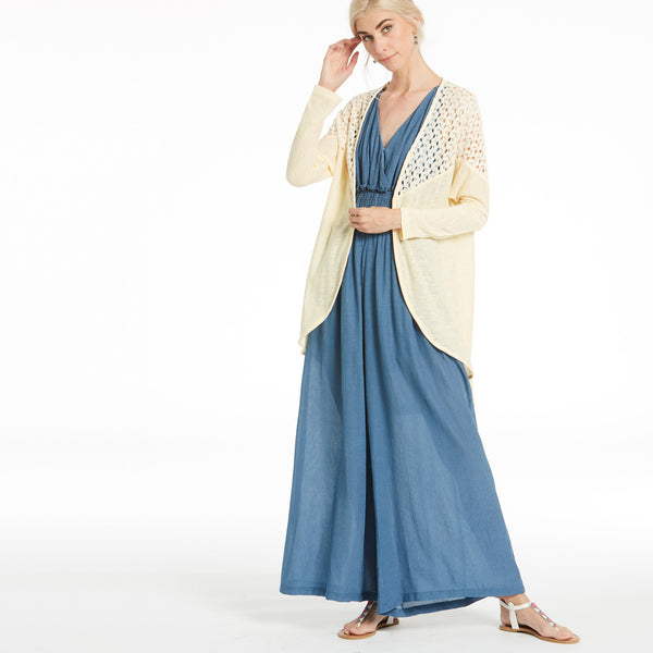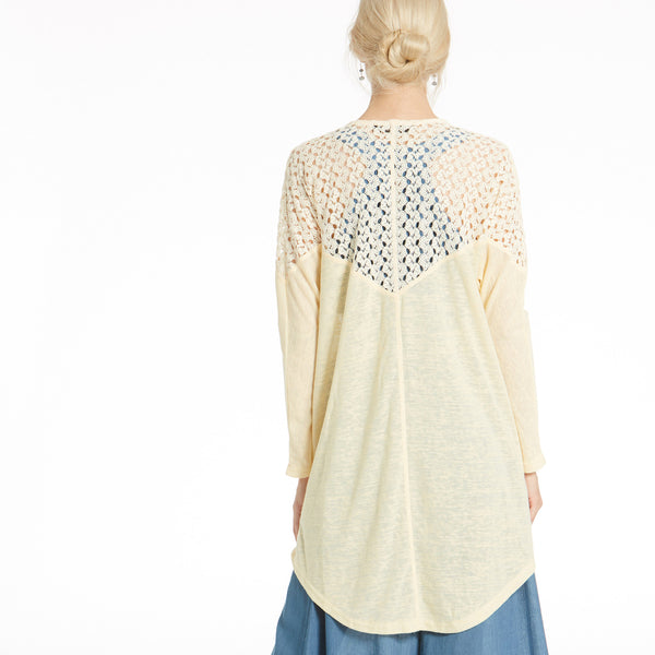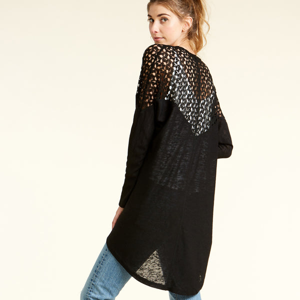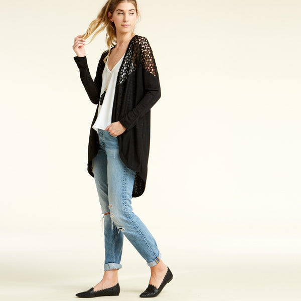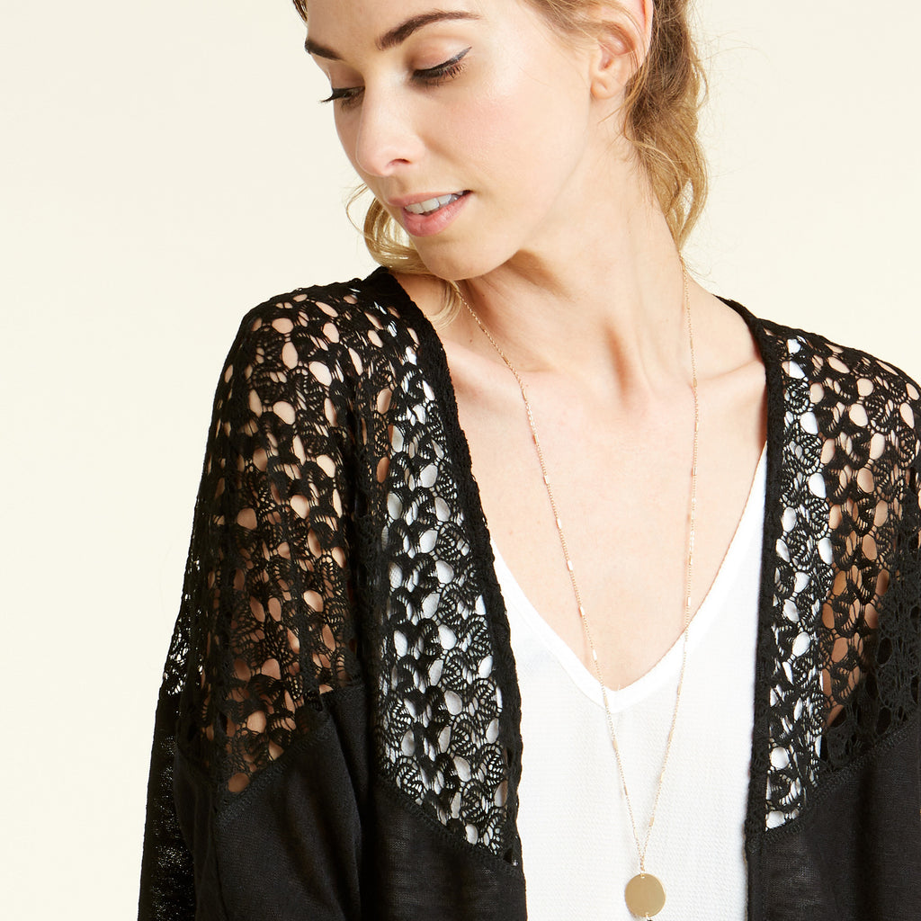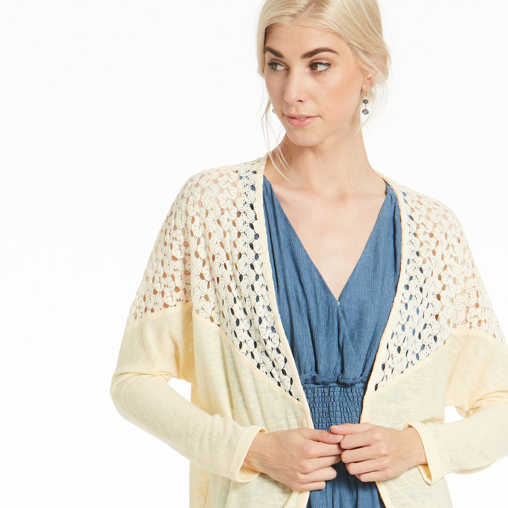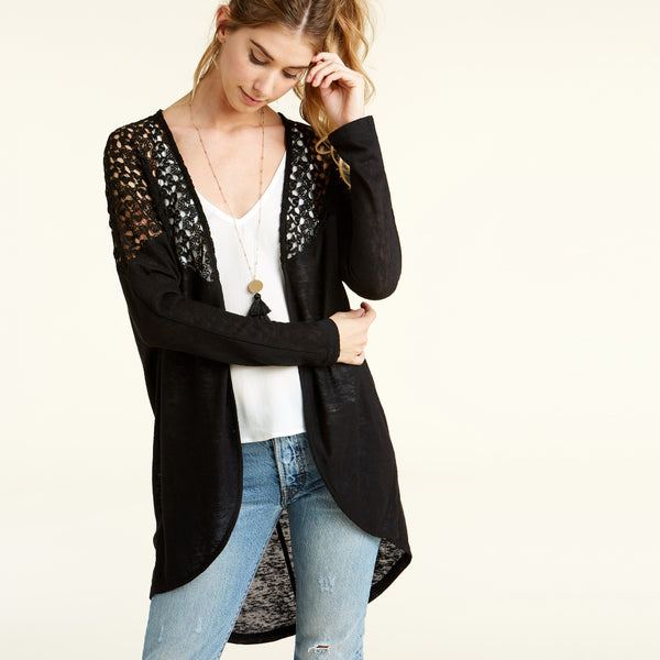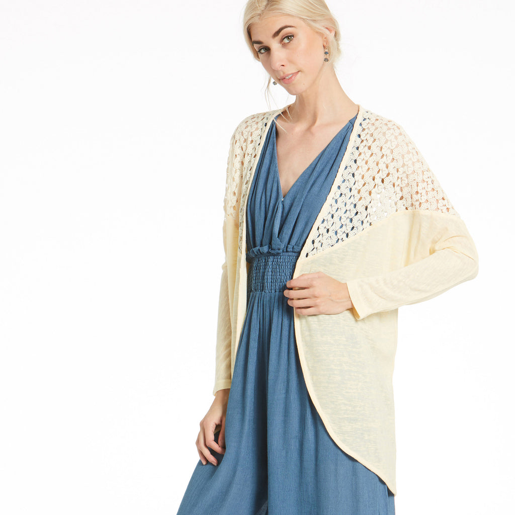 Our Gorgeous On The Go Cardigan has a crochet detail over the shoulder length that perfectly compliments it's simplicity! It's loose fitting and asymmetrical shape with pockets is just what you need to complete your look today!