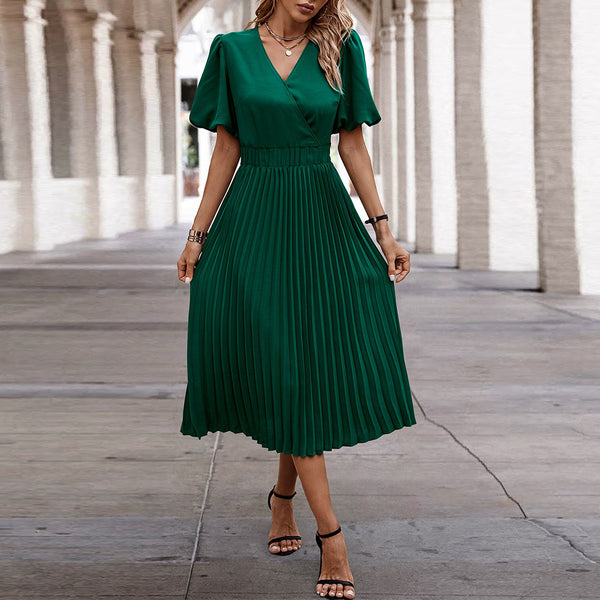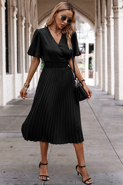The Graceful Pleats Midi Dress exudes effortless charm with its V-neckline, short puff sleeves, and pleated shoulders. Designed for a relaxed fit, it features an elastic waist for comfort and a flowing A-line pleated midi skirt. Crafted from soft, solid-color woven fabric, this timeless piece is perfect for any occasion.