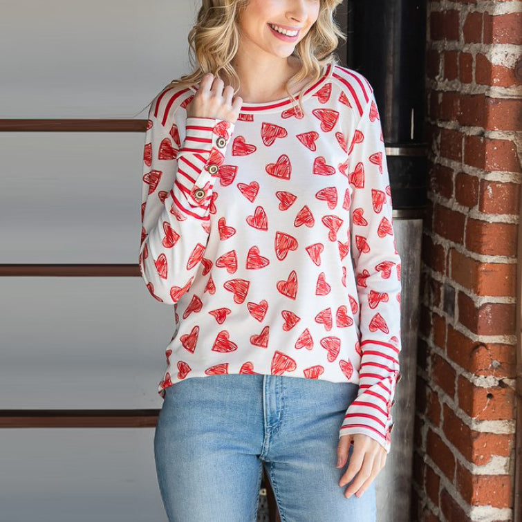 ¡Arriésgate con nuestro top de punto con estampado de corazones! Con un patrón de rayas y corazones en contraste, cuello redondo y dobladillo redondo con botones en los puños, este top es perfecto para las atrevidas y aventureras. Muestra tu lado divertido sin dejar de tener estilo. ¡Adelante, haz una declaración!