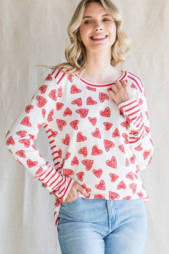 Cuello redondo. Mangas largas. Botones en puño. Dobladillo redondo, contraste de corazones con patrón de rayas.