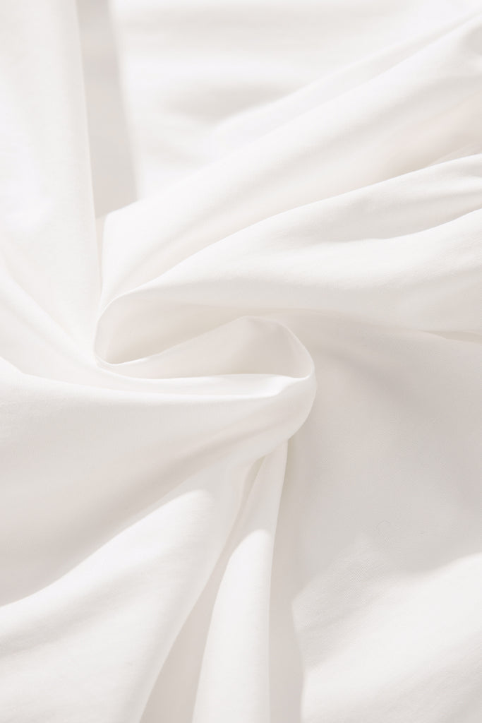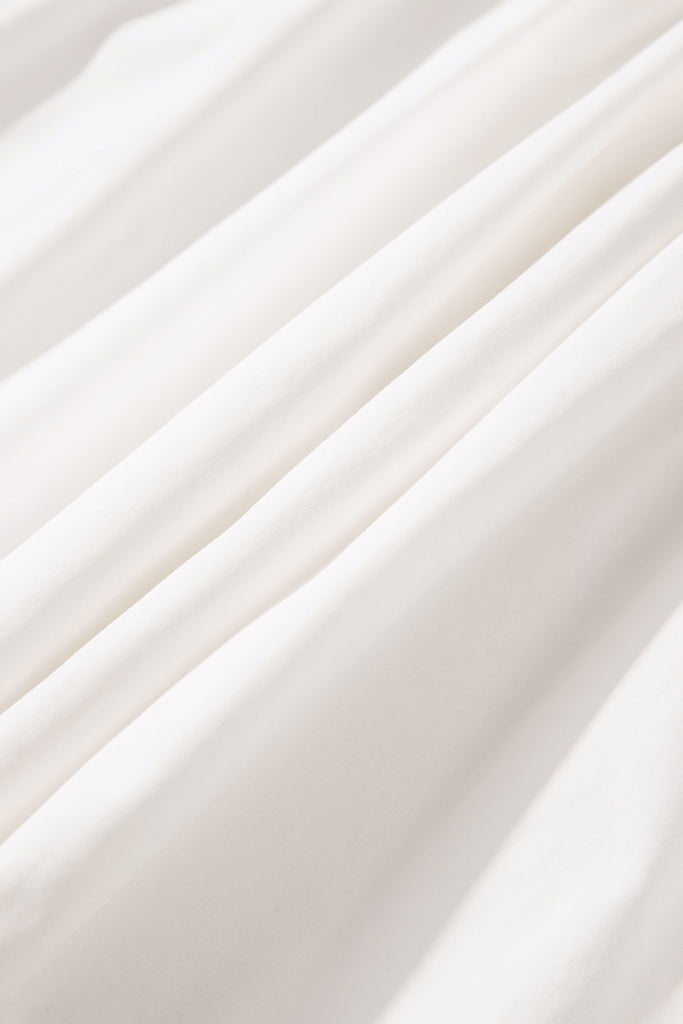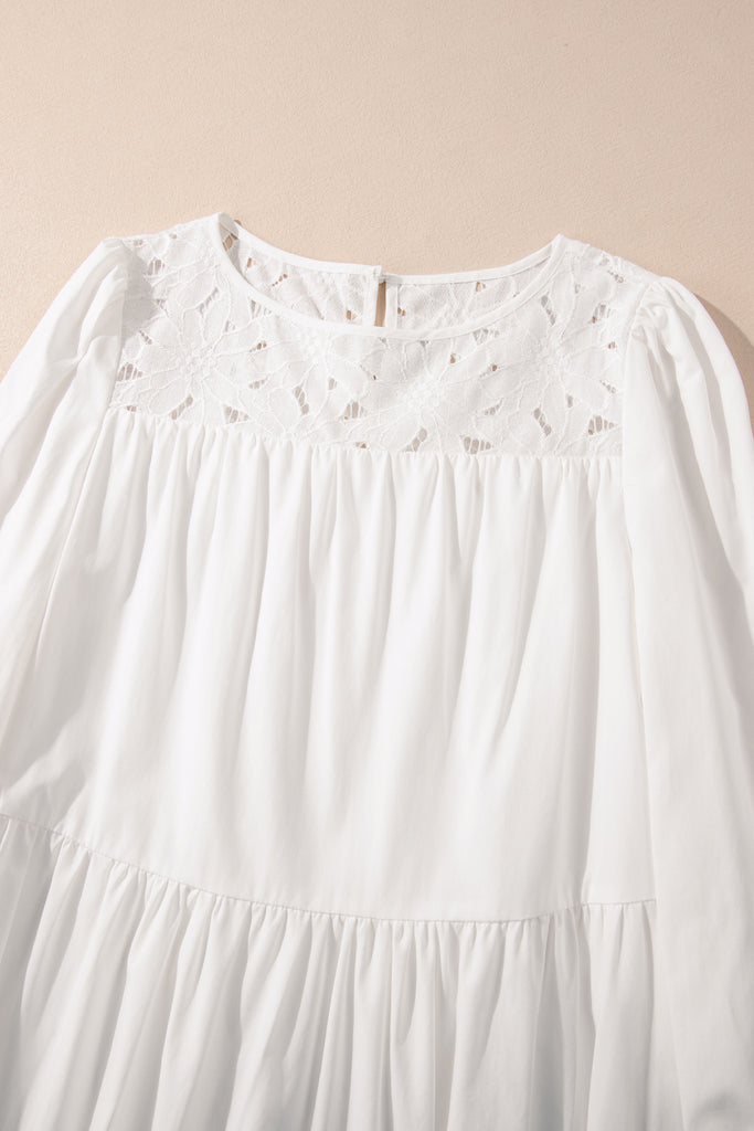 Radiate timeless elegance in the Lace Blossom Whisper Dress. This pure white mini features delicate floral lace yoke at the round neckline with a subtle keyhole back, romantic puffed long sleeves, soft gathered bodice, tiered skirt, and a flouncy ruffle hem. Breezy cotton-blend fabric offers effortless comfort and feminine charm—ideal for weddings, brunches, or sunny escapes. Material: 50% Cotton, 50% Lyocell