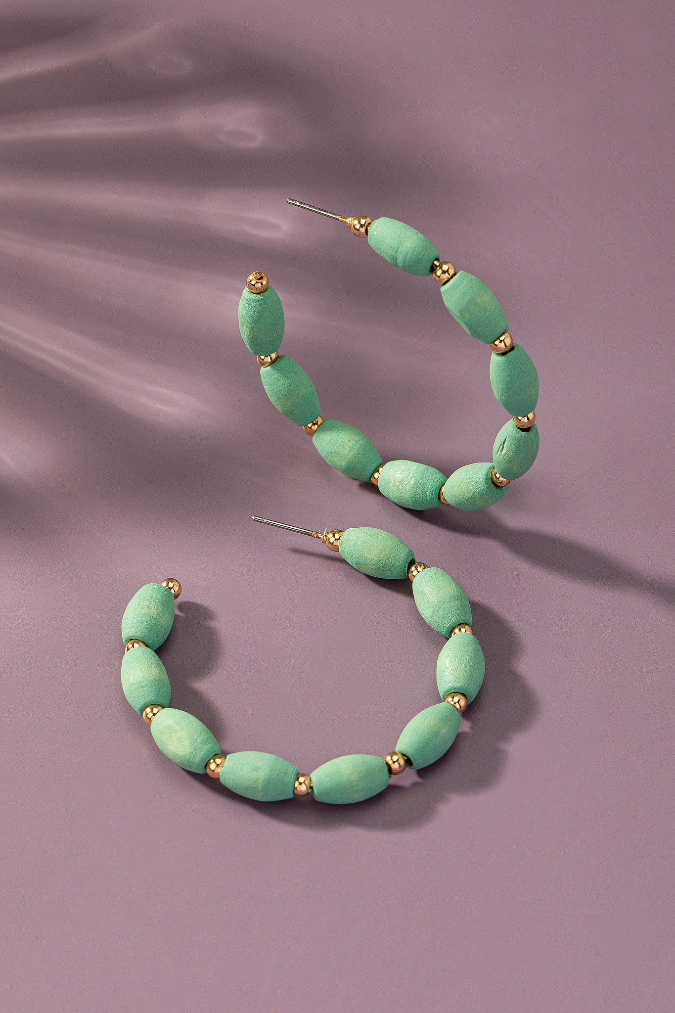 Mint Spindle Shape Wood Beaded Hoop Earrings