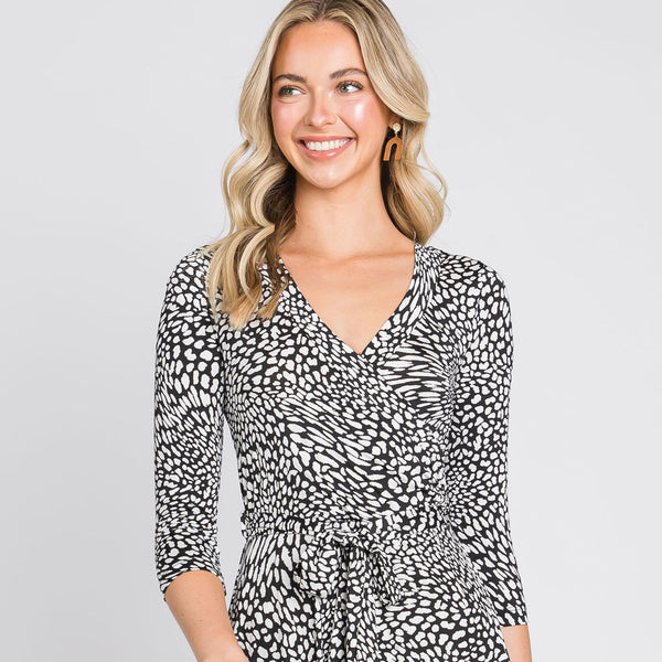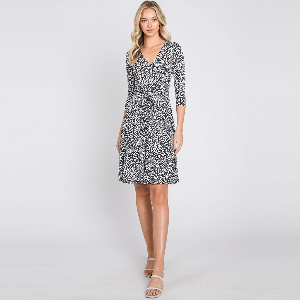 El vestido cruzado esencial Modern Polka Venechia presenta una base blanca con un patrón de puntos abstractos de florecitas negras, mangas 3/4 y un cinturón anudado. El vestido cruzado hasta la rodilla está confeccionado con una lujosa tela venechia que se siente suave y cómoda contra la piel. Es perfecto para cualquier ocasión, con una silueta cruzada versátil y un toque moderno de lunares. Este vestido es una incorporación esencial a tu guardarropa, ya que puedes vestirlo de manera elegante para ocasiones especiales o informal para un día informal.