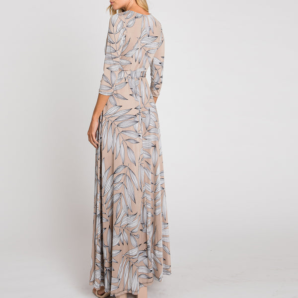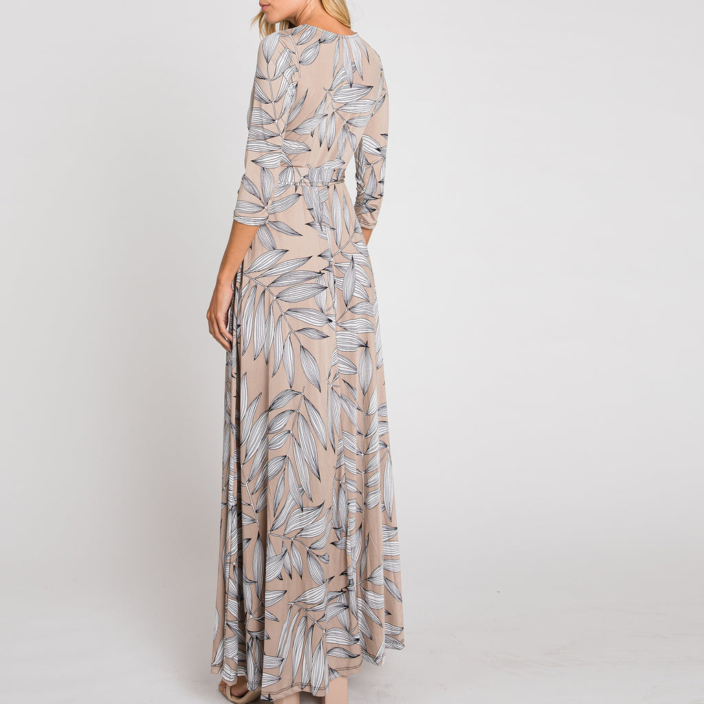 Envoltura con cuello en V. Manga 3/4. Longitud máxima. Corbata de tela. Impresión de hojas de palma. Tela Venechia.