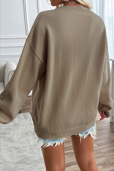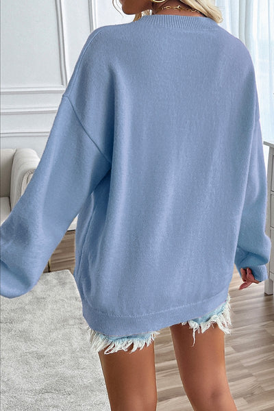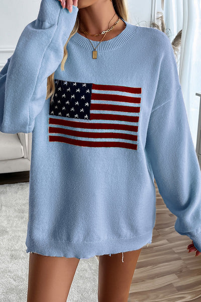 Show your pride in style with the Patriotic Charm Oversized Sweater, featuring a bold American flag pattern on the front. Designed with a round neck, banded cuffs, and hem, this pullover sweater offers a cozy oversized fit with its soft knit yarns. The drop-shoulder design and relaxed fit make it both comfortable and statement-worthy for any casual occasion.