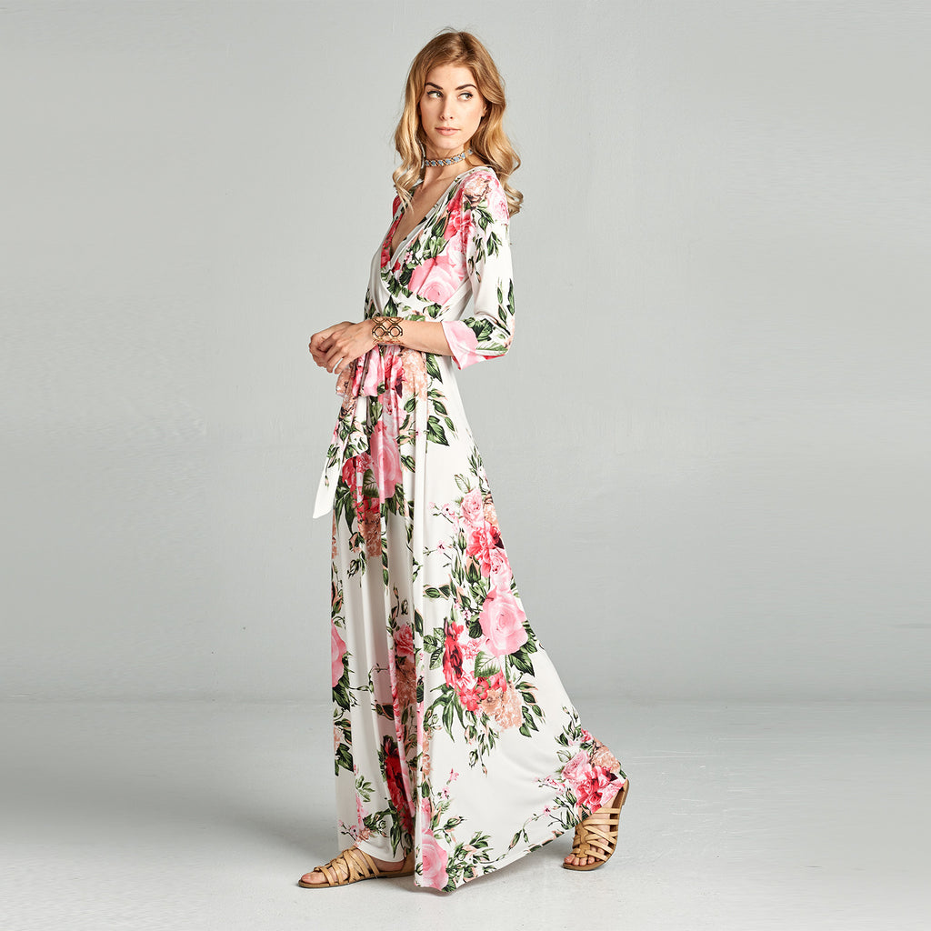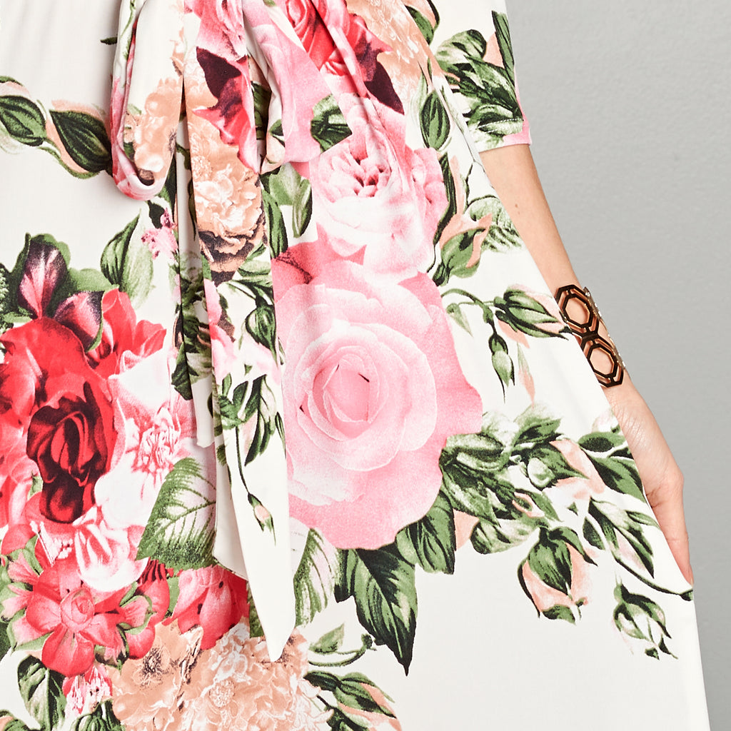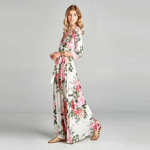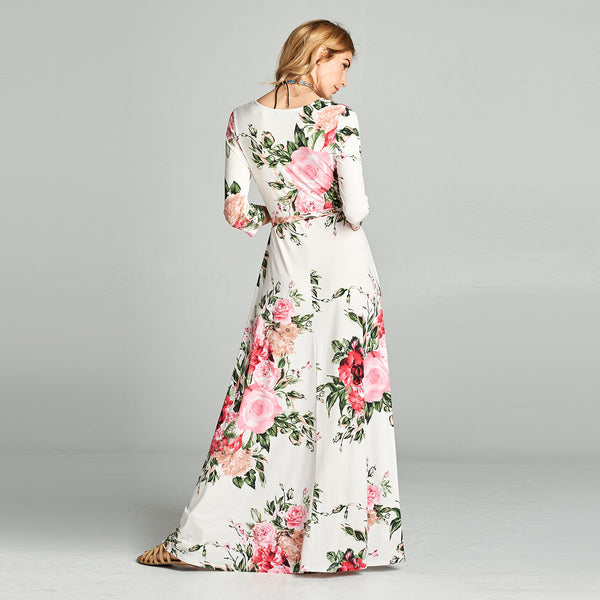 The Rosy Garden Venechia Maxi Wrap Dress is a stunning and feminine piece that features a white base color with an intricate and beautiful roses in shades of pink and green. The V-neckline and waist belt create a flattering silhouette, while the wrap style adds a playful touch. The maxi length of the dress adds sophistication, making it perfect for weddings, proms, or any formal event.