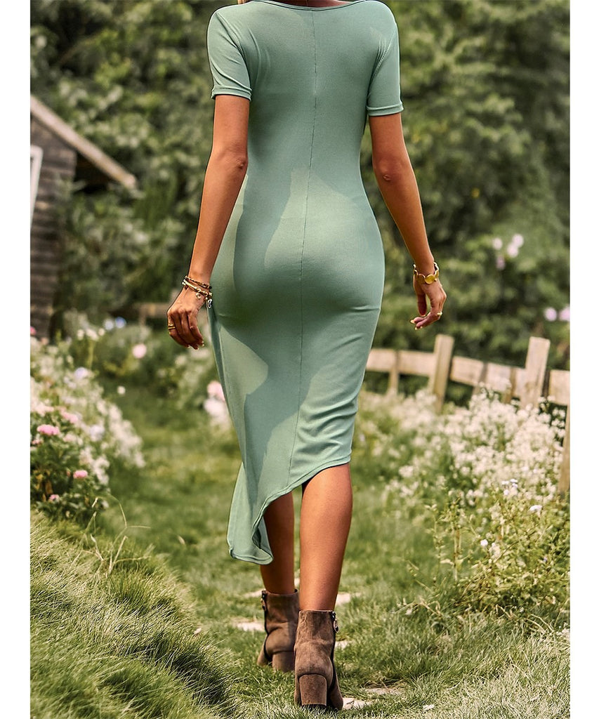 Get ready to turn heads with our Twisted Front Asymmetrical Fitted Dress! This playful dress features a round neck, short sleeves, and a figure-hugging body. The twisted front and asymmetrical wrap add a unique touch, while the fine ribbed knit fabric ensures comfort. Don't miss out on this trendy and quirky addition to your wardrobe!