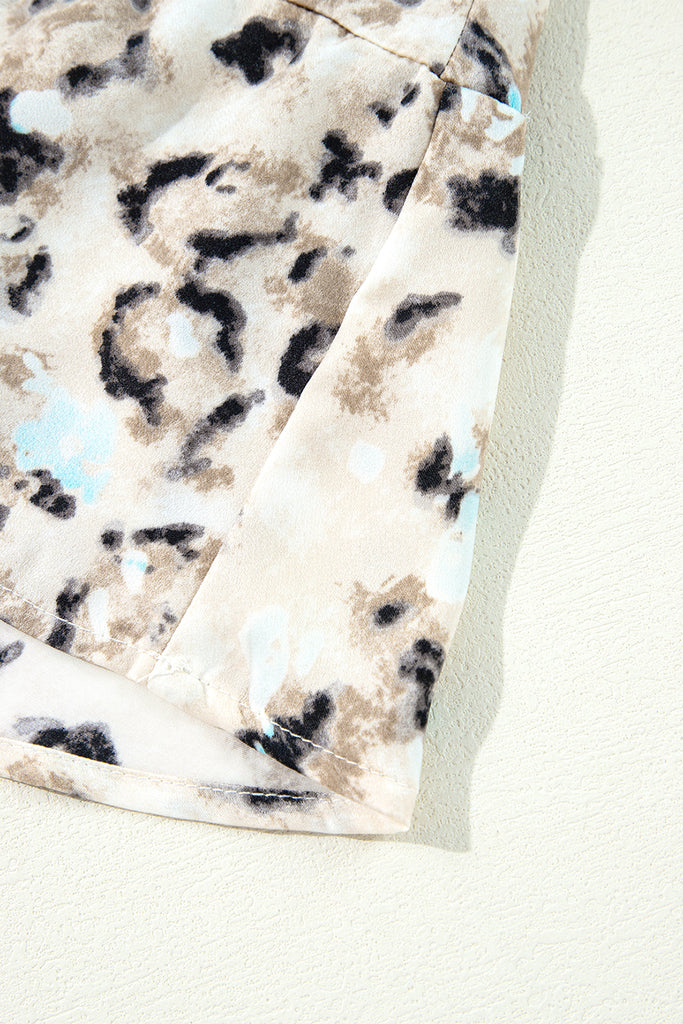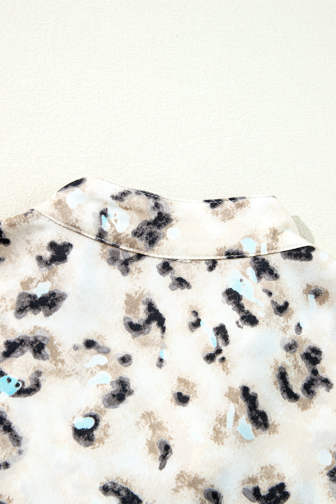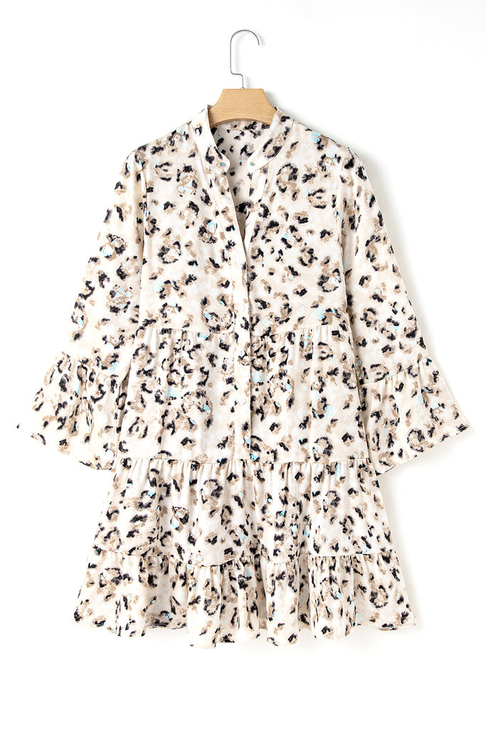 Embrace effortless elegance in the Whispered Leopard Tiered Dream Dress. This soft velvet-textured mini features a subtle leopard print in creamy beige with black and sky-blue accents, a classic collar, button-front, dramatic bell sleeves, and playful multi-tiered ruffle skirt. Perfect for brunch-to-dinner vibes, it offers a relaxed yet feminine silhouette with boho-chic appeal. Material: 100% Polyester