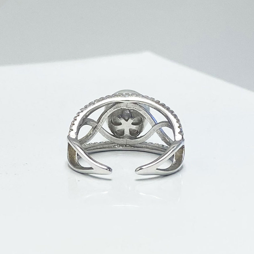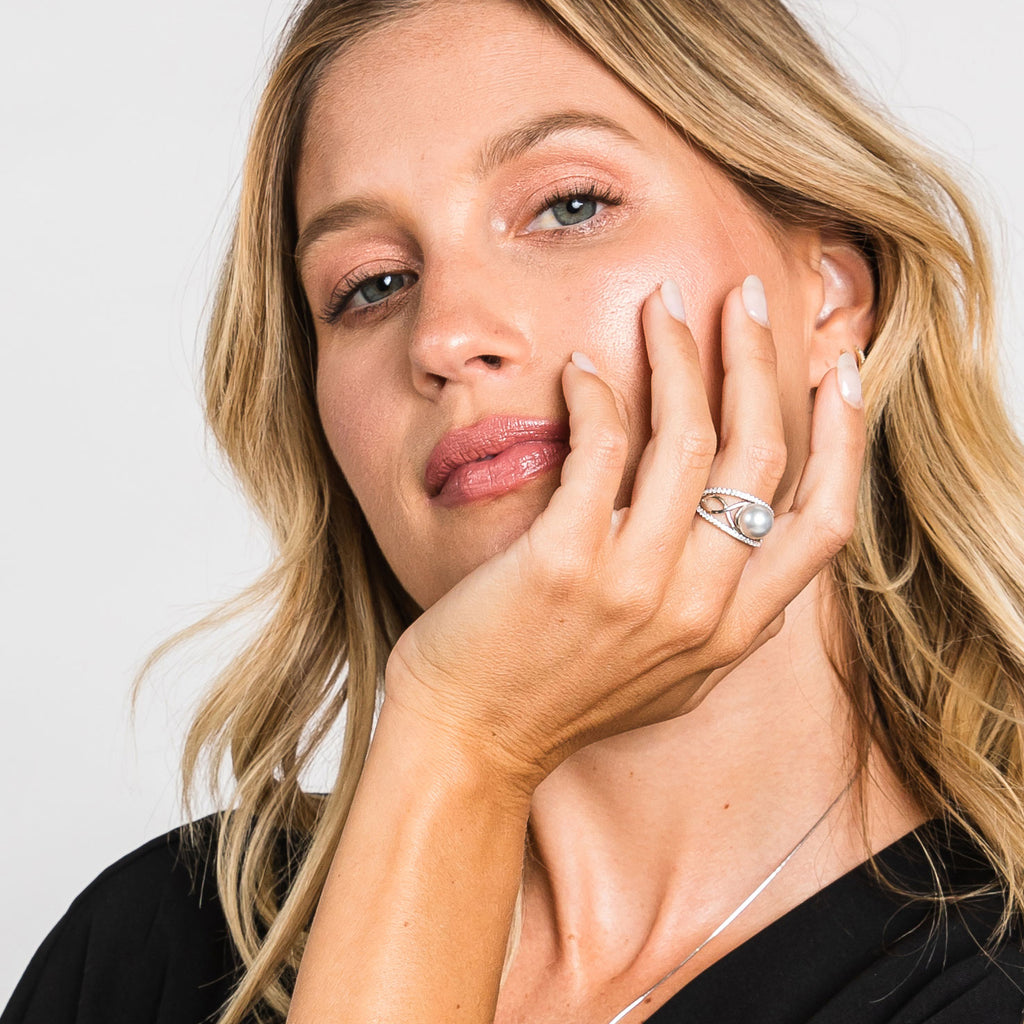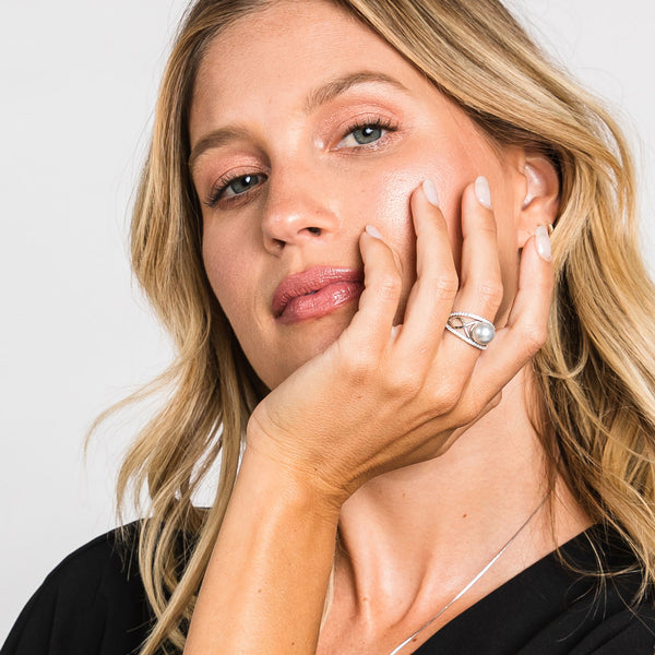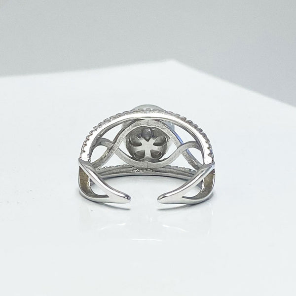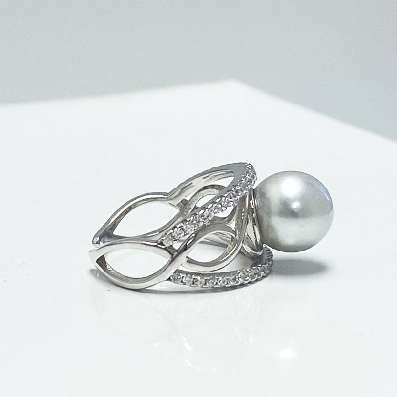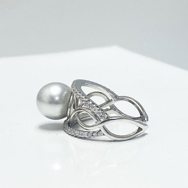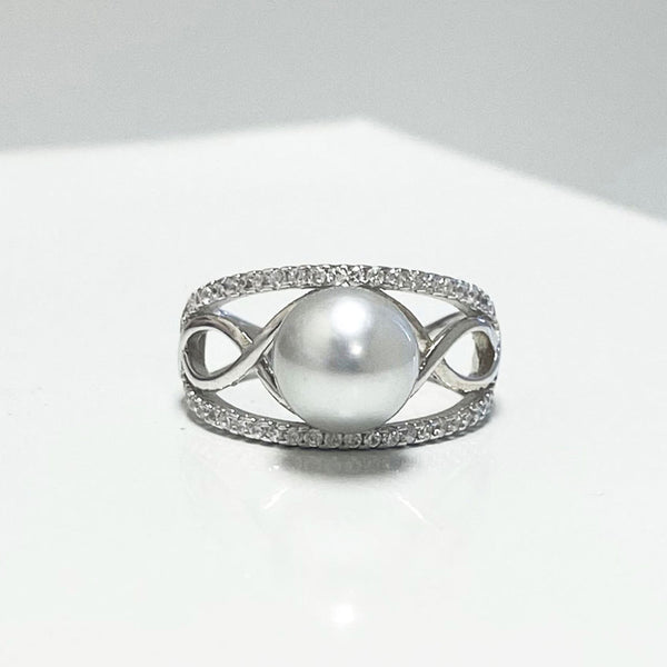 Our South Sea Pearl Loop Ring features a beautiful with pearl with a 3 loop infinity design adorned with dainty stones on the outer band.
