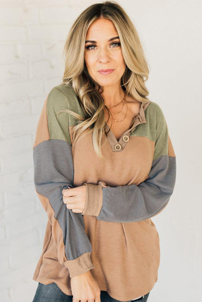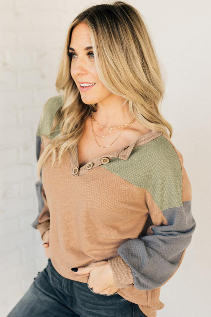 Step into effortless style with the Autumn Hues Henley. Designed in a soft waffle knit with warm color-block tones of tan, olive, and slate gray, this top blends casual comfort with chic detail. The henley neckline with button accents adds a relaxed yet polished touch, while the long sleeves and easy fit make it perfect for layering through the seasons. Pair it with jeans and boots for a cozy autumn stroll or dress it up with accessories for a casual night out.