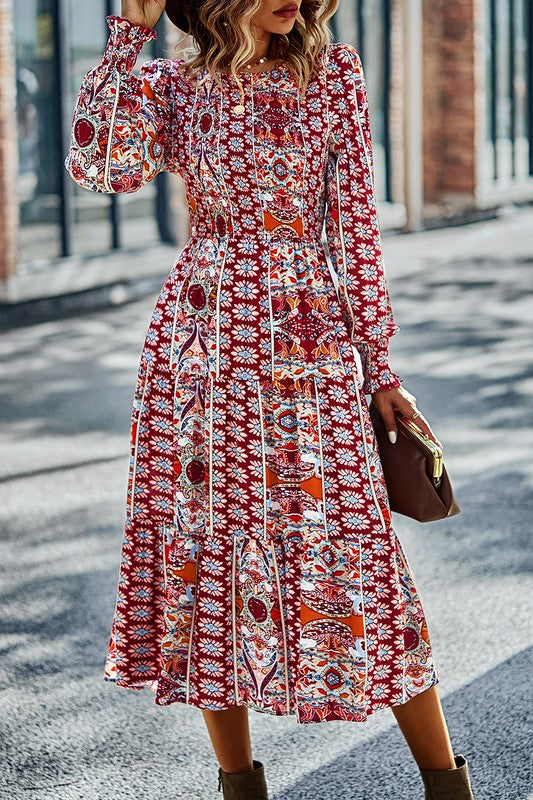 Introducing our Boho Print Midi Dress, a perfect addition to your bohemian-inspired wardrobe. This dress features a round neck and long sleeves with long smocked cuffs, adding a touch of flair to your style. The smocked elastic body and waist provide a comfortable and flexible fit. The tiered midi dress design adds depth and flow to your look, making it ideal for various occasions. Crafted from an allover boho print woven fabric, this dress radiates bohemian charm and is perfect for expressing your free spirit. Embrace the Boho-Boho trend with this stylish midi dress, and let your inner bohemian shine.