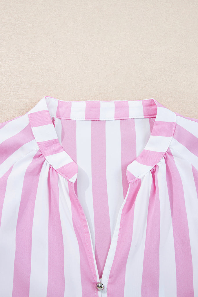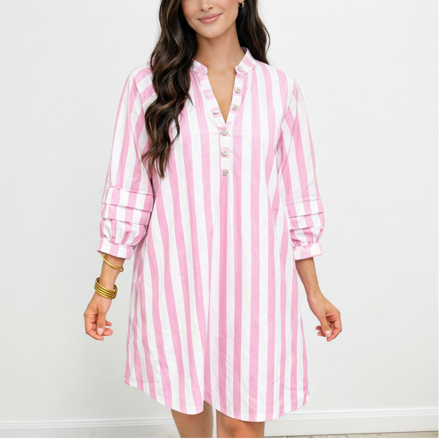 This playful pink-and-white striped mini dress features a soft, lightweight cotton fabric with a classic button-front placket and pearl buttons. Romantic ruffled high collar, deep V-neckline, voluminous balloon sleeves with tie cuffs, and tiered ruffle detailing at the cuffs create feminine volume. Relaxed, flowy fit with a hi-lo hem offers effortless movement. Perfect for summer days, beach vacations, or casual brunches. Pair with sandals and gold jewelry for sweet, sunny style. Material: 100% Polyester. Imported.