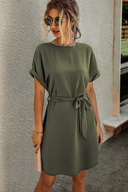 Introducing our Casual Chic Button Back T-Shirt Dress! This versatile piece features a crew neck, short folded sleeves, and a button back closure, making it perfect for a casual day out. The waist tie adds a flattering touch, while the above-the-knee length keeps it fun and flirty. Experience so much style in this loose-fit t-shirt dress!