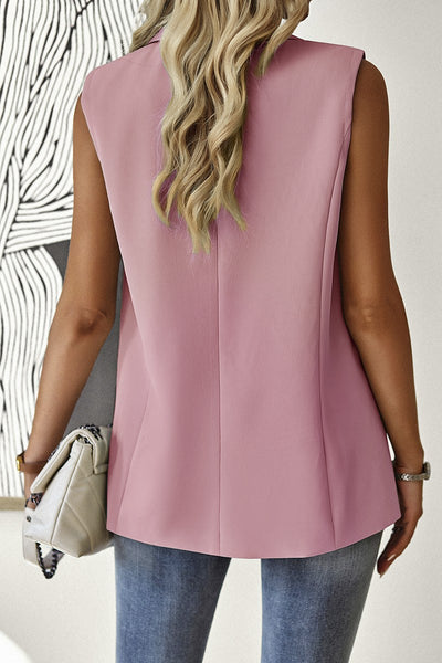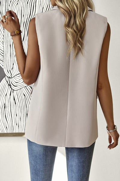 Elevate your style with the Chic Power Vest, a sophisticated sleeveless suit vest featuring a sharp V-neck, peaked lapels, and a tailored one-button front closure. Designed with a relaxed fit and functional side pockets, this solid color woven vest is perfect for layering over blouses or pairing with matching trousers for a polished, modern look.