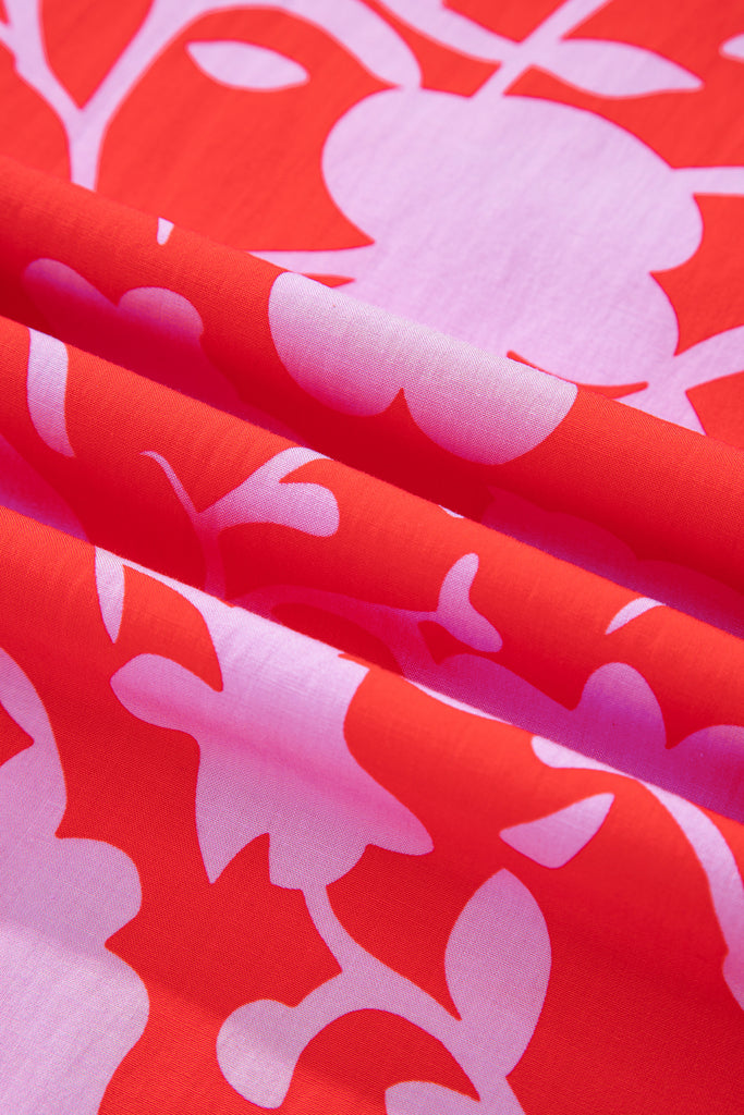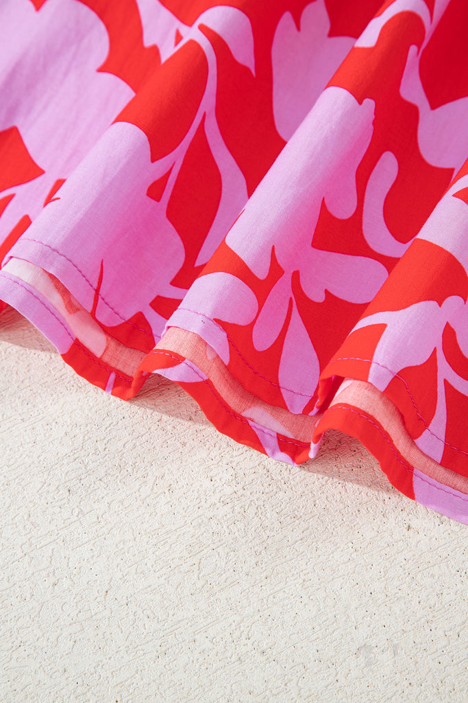 Vibrant coral-red blouse blooming with oversized lavender peonies and soft green leaves on a lightweight, slightly sheer fabric. Features a flattering V-neck with contrasting lilac trim, dramatic puffed long sleeves gathered at elasticized cuffs, and a relaxed yet feminine silhouette. Perfect for elevating jeans, shorts, or skirts—ideal for brunches, vacations, or warm-weather dates with effortless elegance. Material: 55% Cotton, 45% Viscose