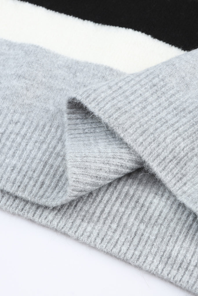 Stay chic and comfortable all season long in our Cozy Contrast Stripes Sweater, designed with a modern colorblock palette of warm camel, sleek black, classic ivory, and soft heather grey. The relaxed crew neckline and drop-shoulder sleeves create a laid-back silhouette, while the ribbed cuffs and hem add a polished touch. Perfectly versatile, this cozy knit pairs effortlessly with denim, trousers, or leggings, making it your go-to sweater for casual outings, coffee runs, or a cozy evening in.