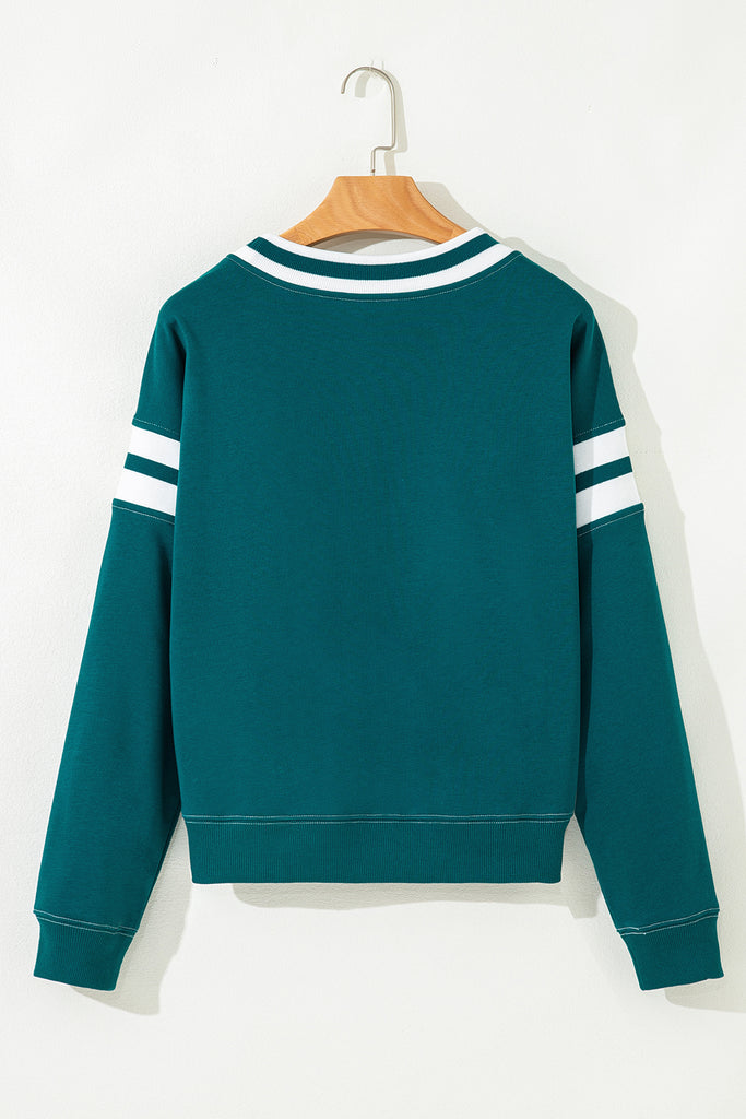 Step up your casual style with the Evergreen Varsity Stripe Sweatshirt. Featuring a classic crew neckline with bold double-stripe detailing and sporty sleeve accents, this sweatshirt brings a retro athletic vibe with a modern twist. The relaxed fit and soft cotton-blend fabric keep you comfortable all day, while the ribbed cuffs and hemline add structure and durability. Perfect for pairing with jeans, joggers, or layered over leggings, this versatile piece will quickly become your new weekend favorite.