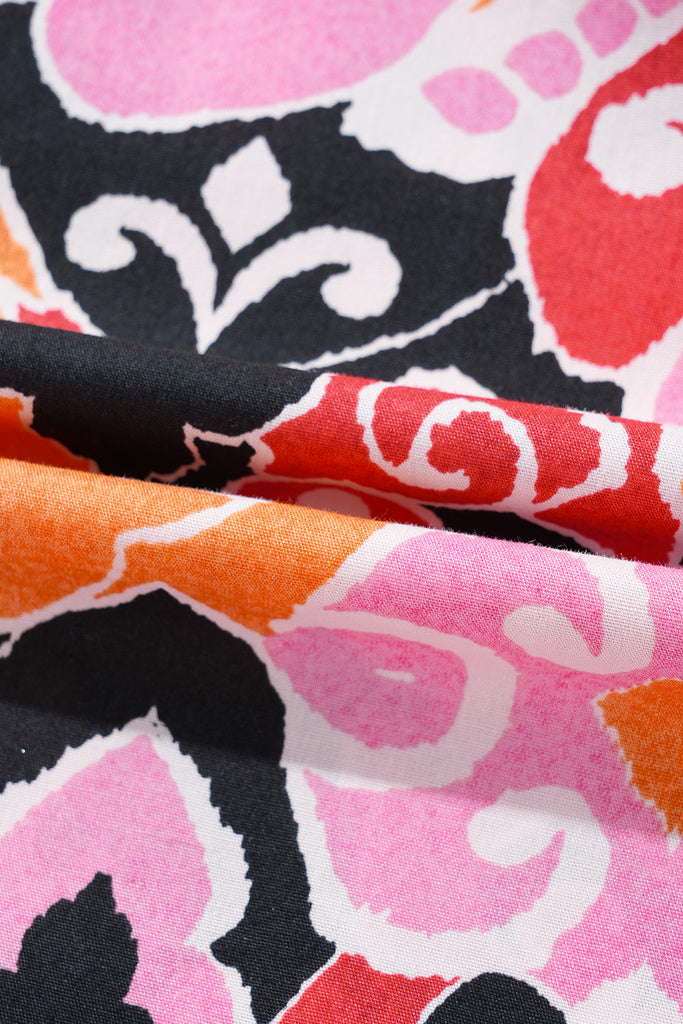 Vibrant square-neck mini dress exploding with bold psychedelic florals, flamingos, and intricate paisley motifs in hot pink, coral, orange, and black. Features dramatic puffed bishop sleeves, elasticized off-shoulder neckline, smocked back panel, empire waist with pink contrast piping, tiered ruffle hem, and convenient side pockets. Playful, bold, and perfect for beach parties, vacations, or summer soires. Material: 100% Cotton. Imported.