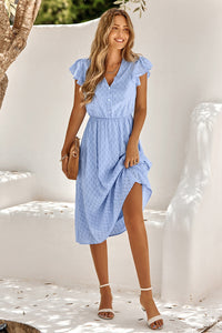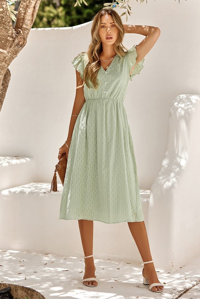 Step into effortless style with the Geo Breeze Midi Dress. Featuring a flattering V-neckline, charming ruffled cap sleeves, and a button front, this relaxed A-line silhouette is both breathable and beautiful in 100% cotton. The geometric rectangular print adds a modern, playful touch — perfect for sunlit strolls and casual gatherings.