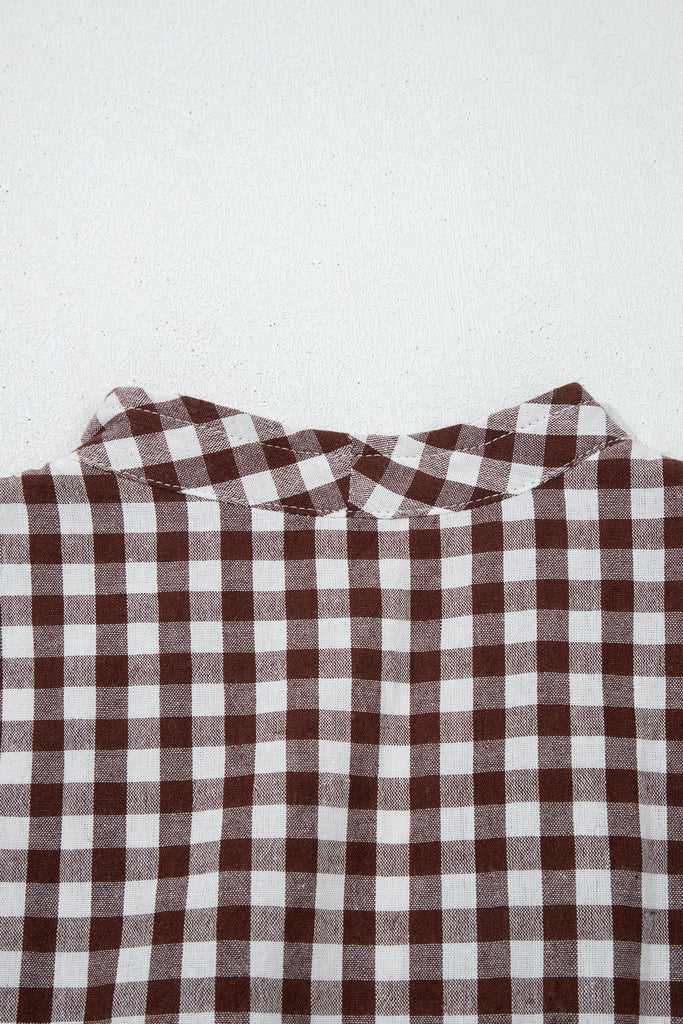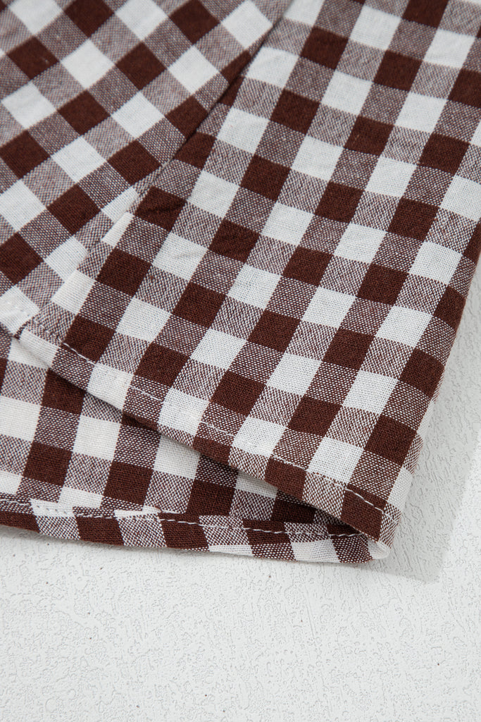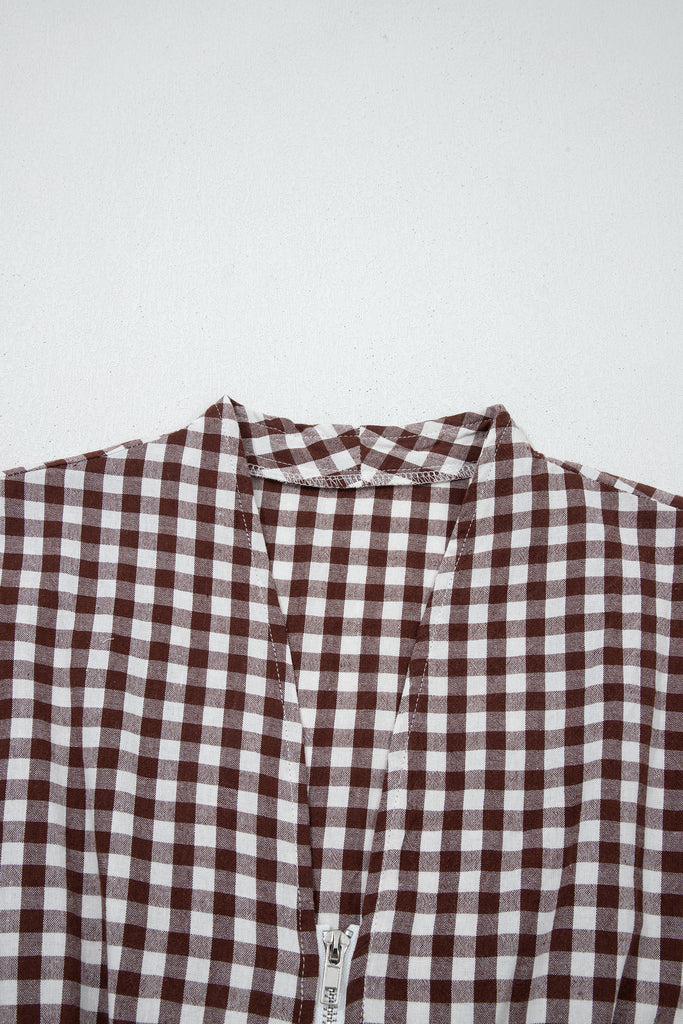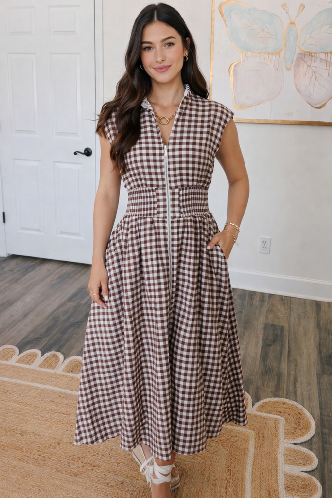 Classic gingham gets a modern update in this chocolate-brown and white check midi dress. Featuring a collared V-neckline, front zipper closure for easy wear, sleeveless design with subtle cap shoulders, elastic smocked waist for flattering definition, and a full, flowy A-line skirt with gentle gathering. Lightweight cotton-blend fabric offers breathable comfort—perfect for casual days, picnics, or summer office looks paired with sandals or sneakers. Material: 100% Cotton