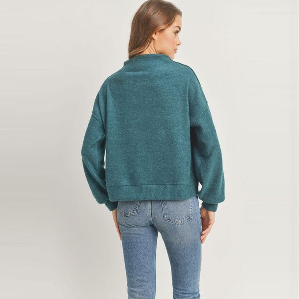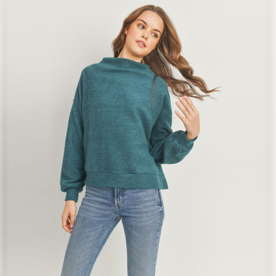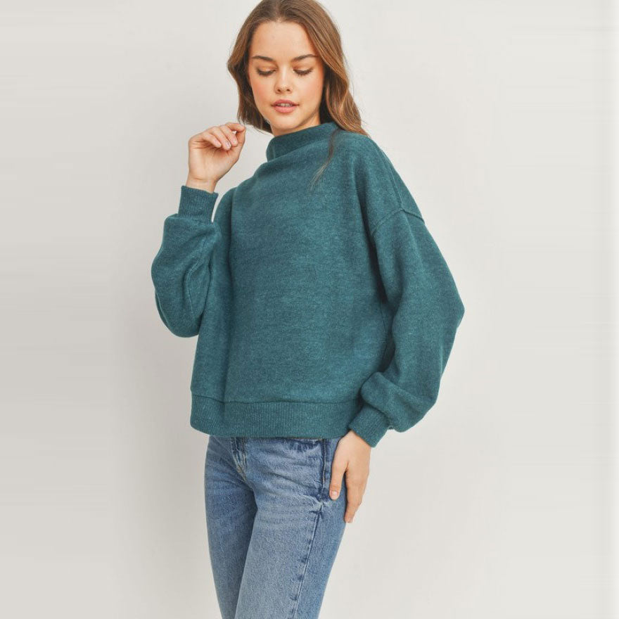 Mock or High neck. Long Sleeves. Drop Shoulder. Loose fit. Brushed Knit.