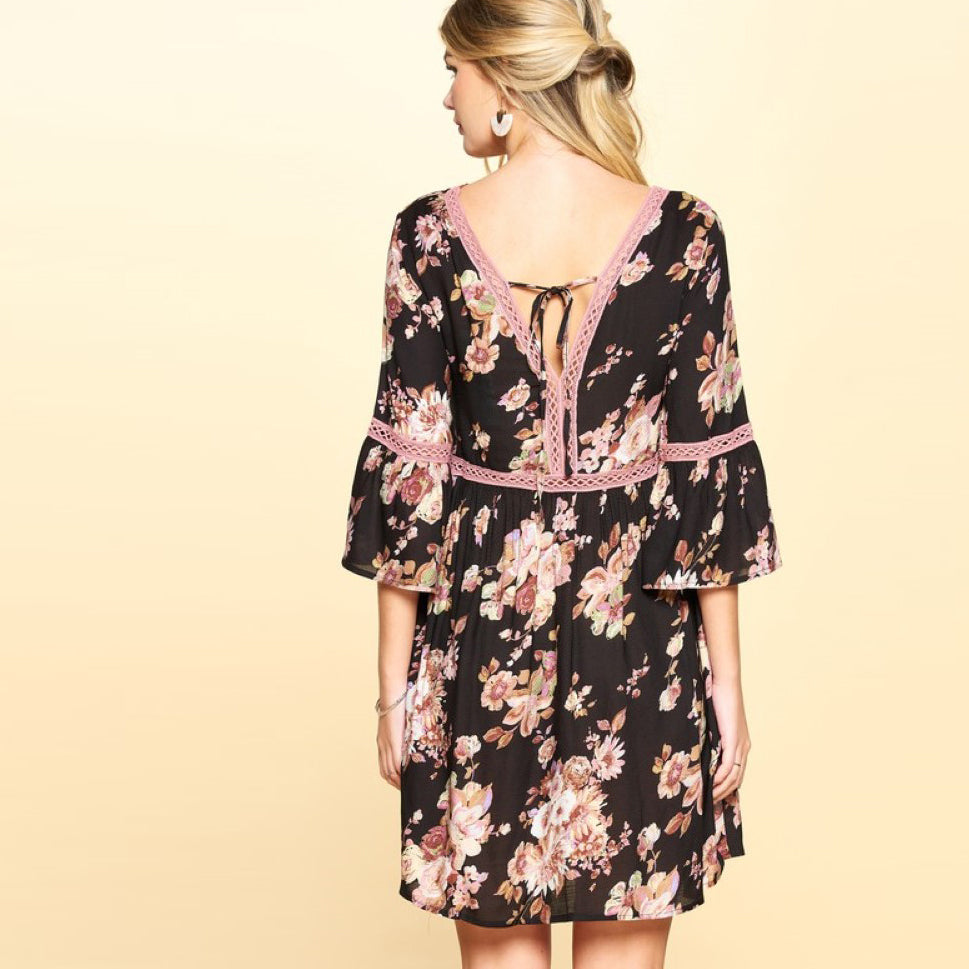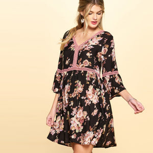 Floral Print. 3/4 Bell Sleeve. Embroidery Detail. V-Neck. Baby Doll.
