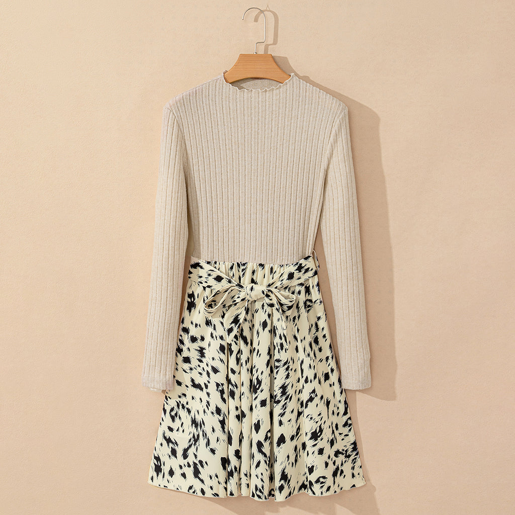 Soft, ribbed knit meets a playful, flowy skirt in this stunning mixed-media dress. The fitted top flatters while the spotted skirt adds movement and charm. Finished with a waist tie for a feminine, adjustable fit. Effortlessly stylish for brunch dates, workdays, and everything in between. Material: 85% Polyester, 10% Viscose, 5%Elastane. Imported.