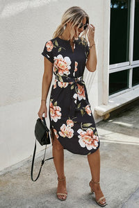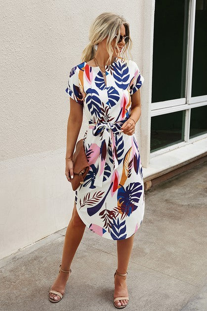 Effortless charm meets everyday ease in the Meadowline Midi Dress. Featuring a flattering V-neck with a subtle notched detail, short sleeves with folded cuffs, and a removable belt to define your waist, this midi-length silhouette flows with comfort and style. Finished with a rounded hem and offered in vibrant floral or geo prints on soft woven fabric, it’s the perfect go-to for workdays or weekends.