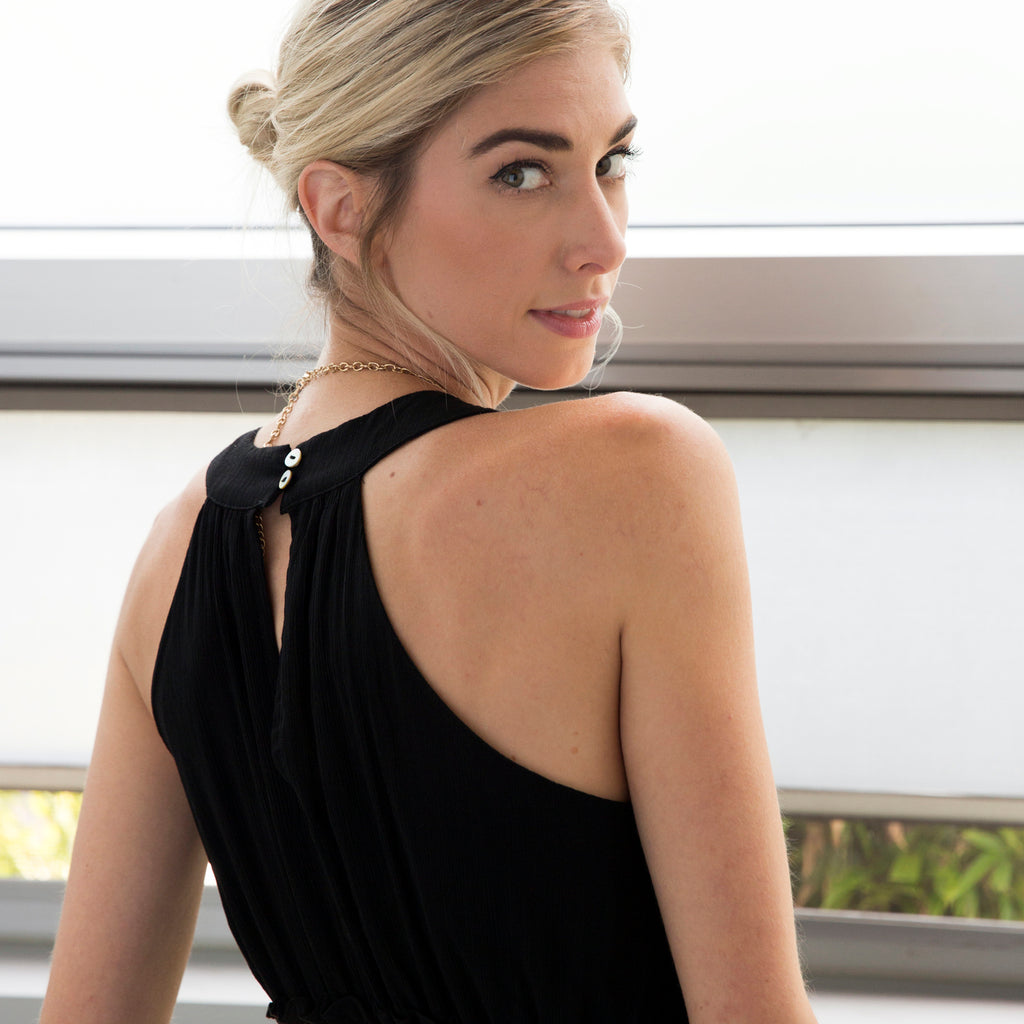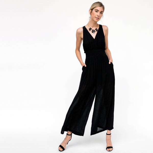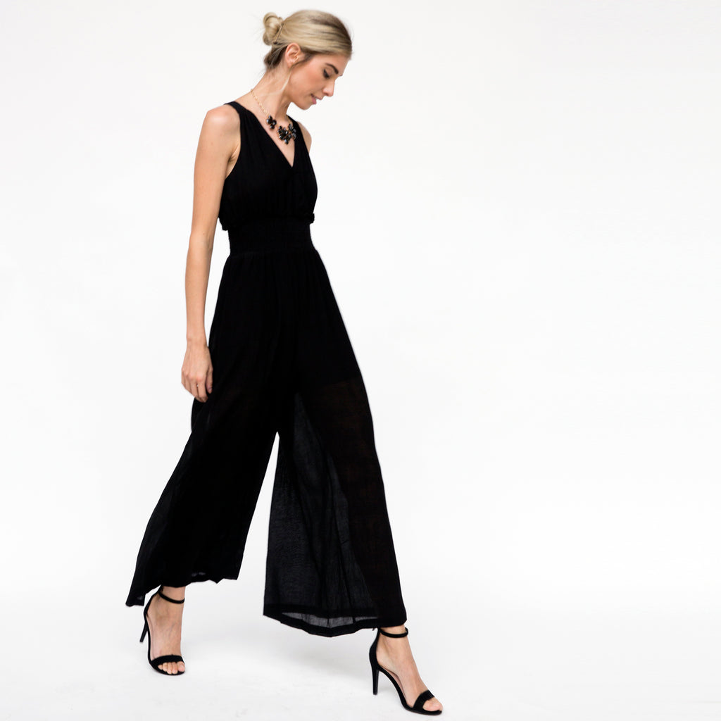 We are loving this easy to wear lightweight stylish jumpsuit. It's airy and flowy, perfect for those summer nights, yet easily styled for the transition. It has a pleated design and an elastic cinched waist very forgiving and shape forming. The beautiful V-neckline gorgeously show off your collarbone and the keyhole cross-back is very tasteful. Works nicely with a pair of casual sandals for an evening stroll on the beach.