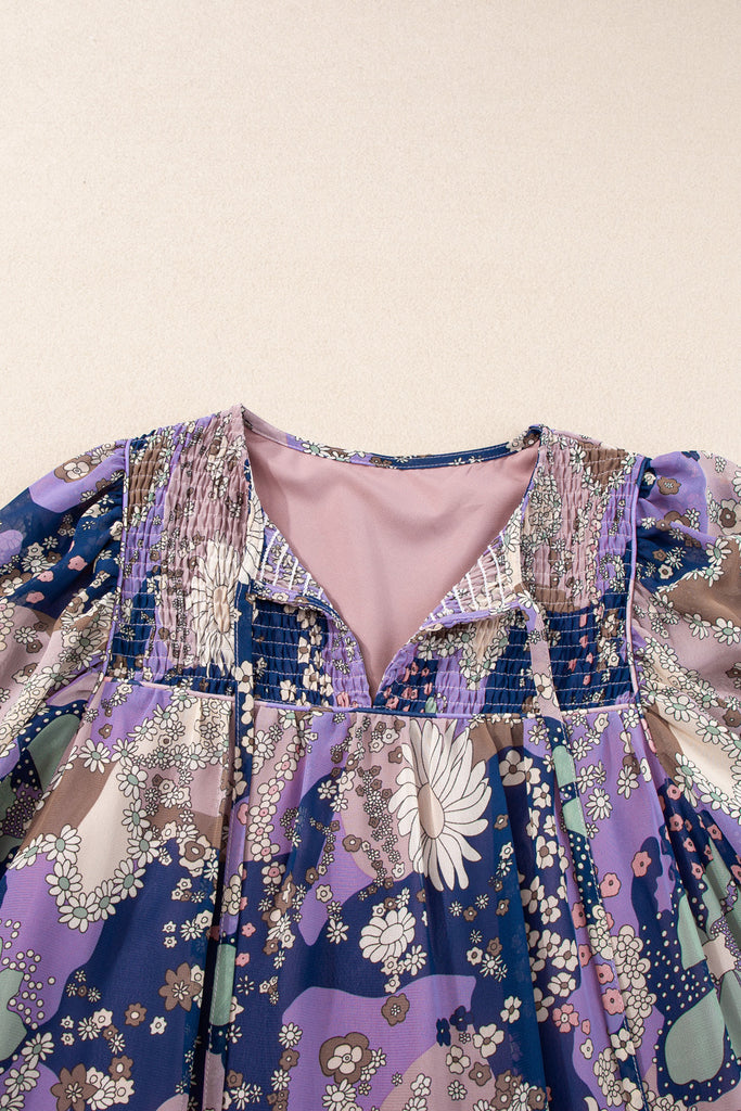 Step into effortless charm with our Moonlit Meadow Smock Dress. Featuring a dreamy floral patchwork in purple and navy tones, smocked bodice, and billowy sleeves, this flowy tiered dress is perfect for brunch dates, weekend strolls, or garden parties. Style with boots or sandals for all-season chic. Material: 100% Polyester. Imported.