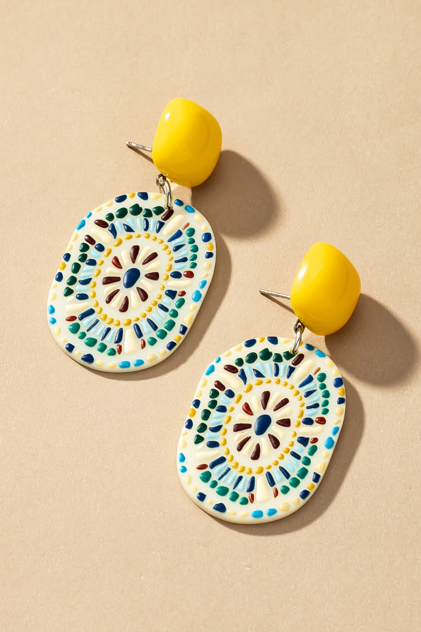 Vibrant and chic, these acrylic oval mosaic drop earrings add a colorful touch to any outfit with their bold, artistic design.