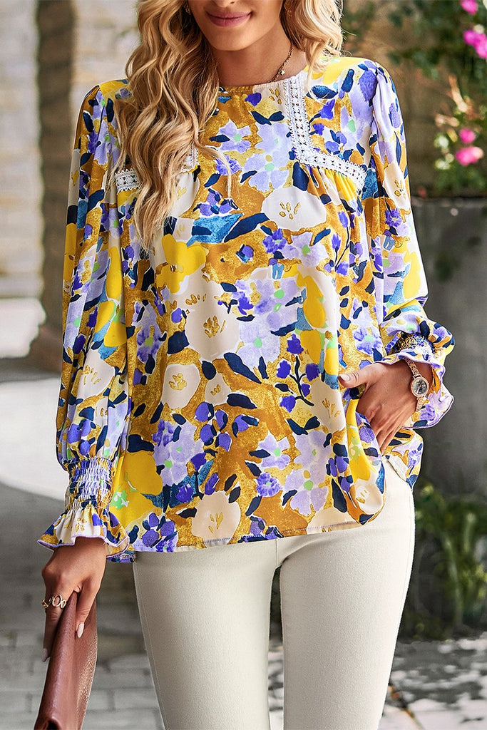Elevate your everyday elegance with the Painter’s Bloom Blouse. Featuring a classic round neckline and long sleeves with smocked ruffled cuffs, this blouse is beautifully detailed with delicate lace trims across the front and back. The pleated shoulders and flowy relaxed fit add a soft drape, while the allover painterly floral print gives it a romantic, artistic charm. A back button closure completes this graceful, hip-length silhouette—perfect for both office hours and afternoon strolls.