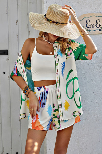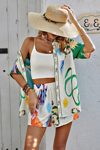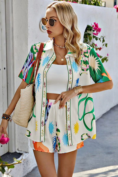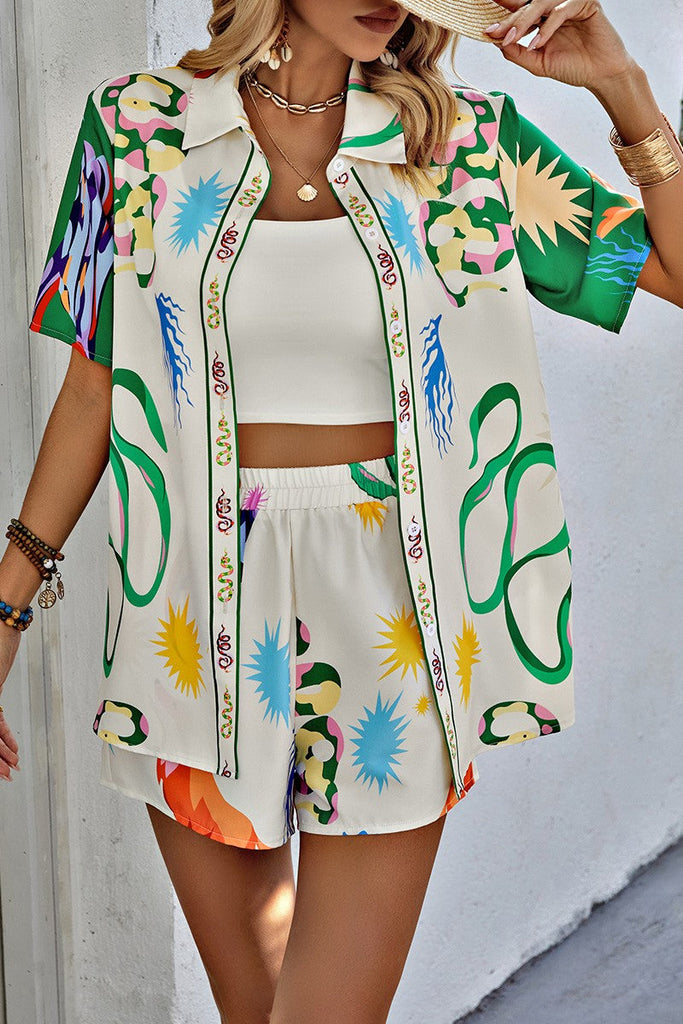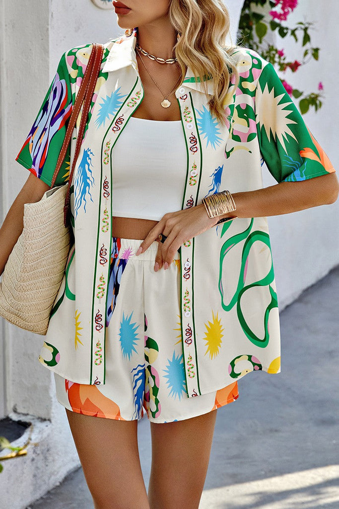 Dive into artistic expression with our Painter's Paradise Shirt & Shorts Set. The shirt features a collar neck, short sleeves, and a button front, while the shorts boast a comfortable elastic waist and matching print. Crafted from a beige fabric adorned with an allover artist's paint pattern, this set is a masterpiece of style and comfort.