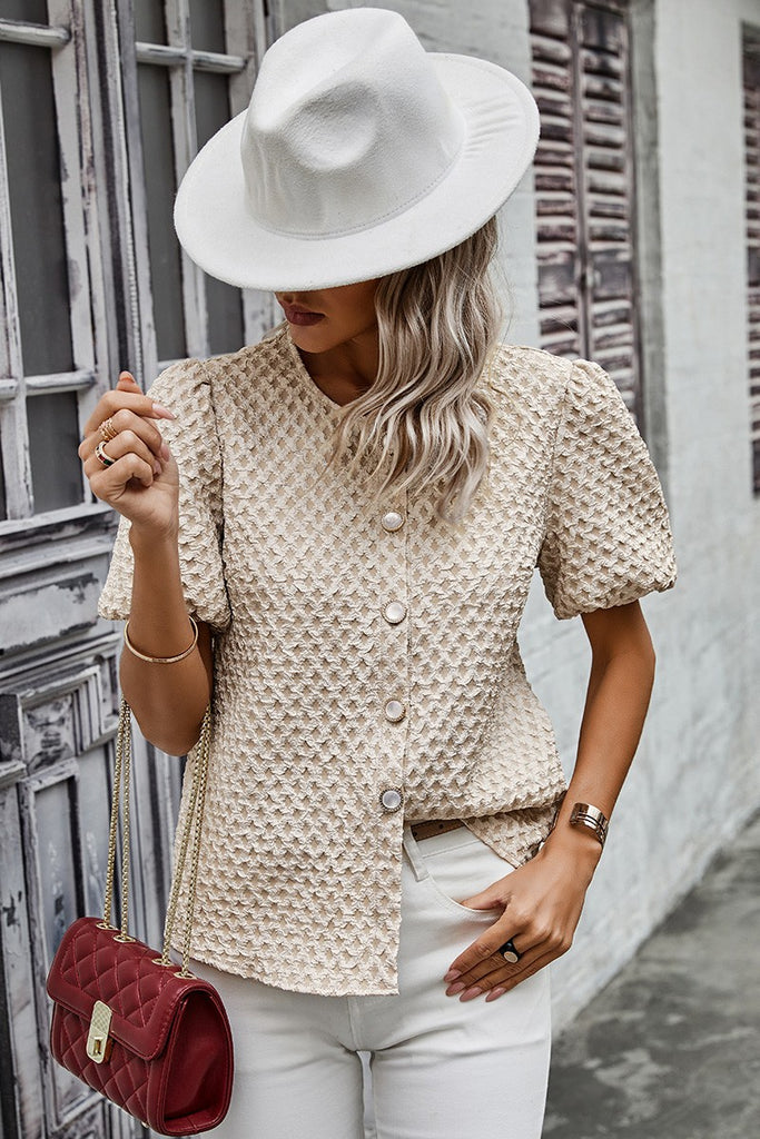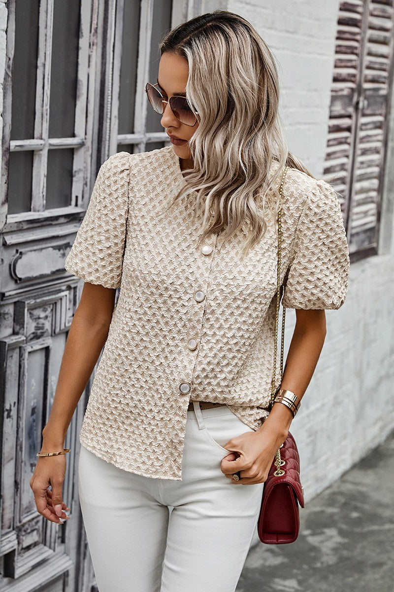 Introducing our Pearl Adorned Textured Shirt, a blend of elegance and sophistication. This shirt features a round neck and short puff sleeves, adorned with delicate pearl buttons on the front for a touch of glamour. Crafted from textured woven fabric, it offers a unique and stylish look. With its relaxed fit and hip length design, this shirt is perfect for both casual and formal occasions.