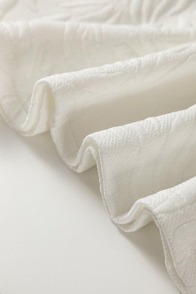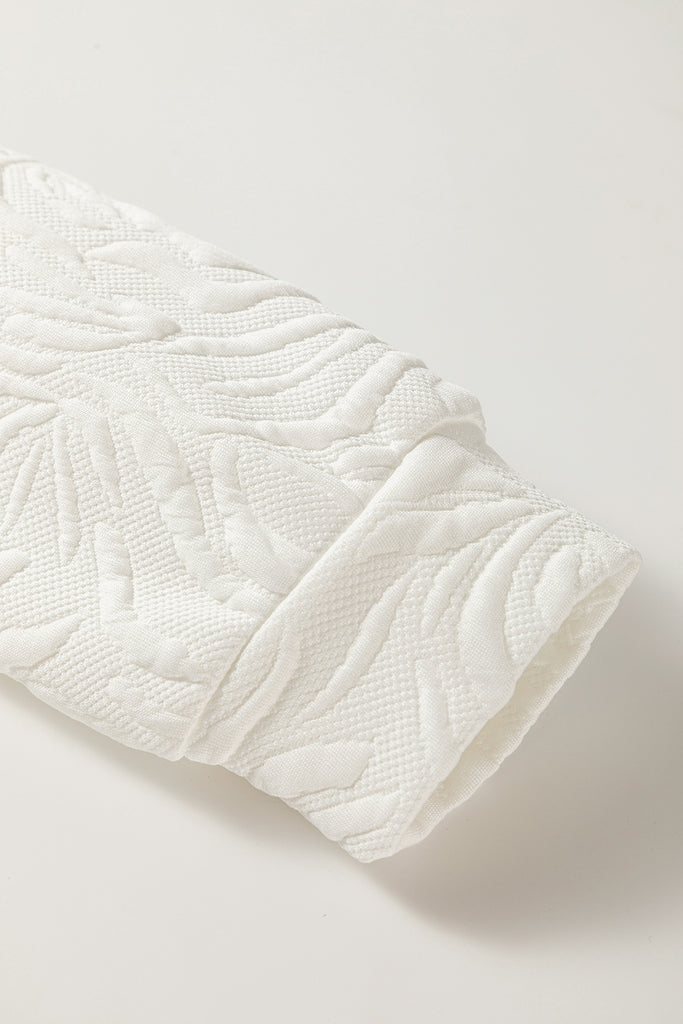 Elegant ivory quilted mini dress with intricate palm leaf embossing throughout for rich texture and subtle dimension. Stand collar with bold green, black, and cream stripe placket featuring a gold zipper closure. Long sleeves with slight gathering at the cuffs create soft volume. Relaxed shift silhouette with a flattering above-knee length offers effortless sophistication. Lightweight yet structured fabric perfect for transitional weather. Style with boots and gold jewelry for chic everyday elegance or layer with tights for cooler days. Material: 97% Polyester, 3% Elastane. Imported.