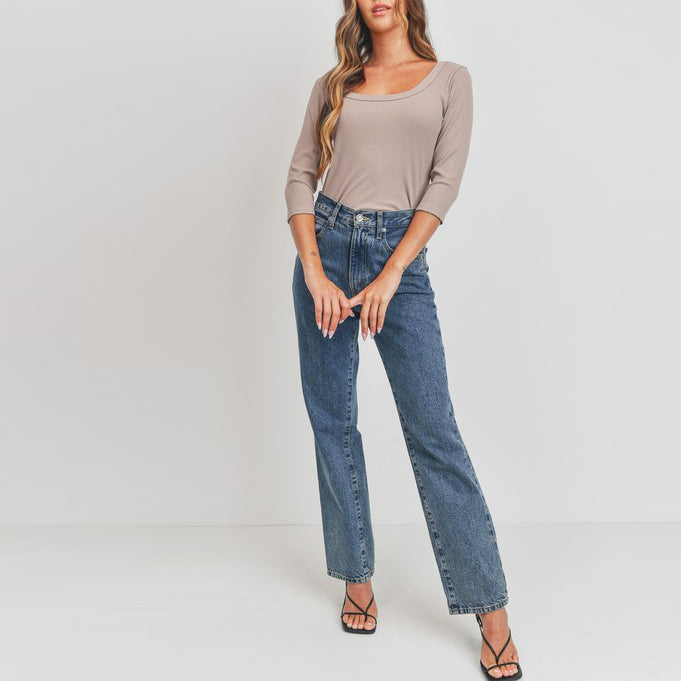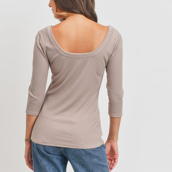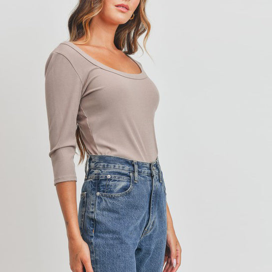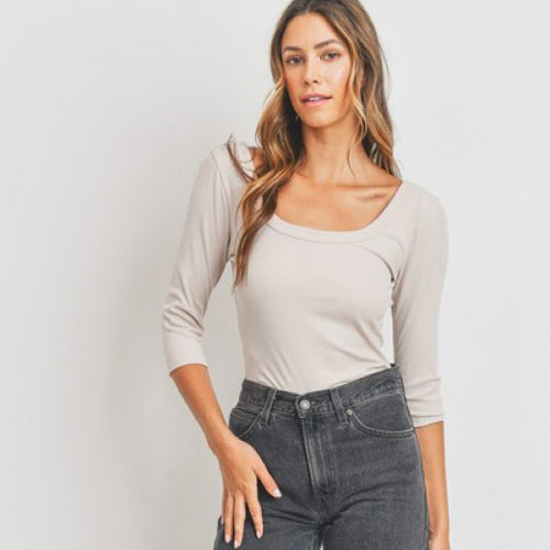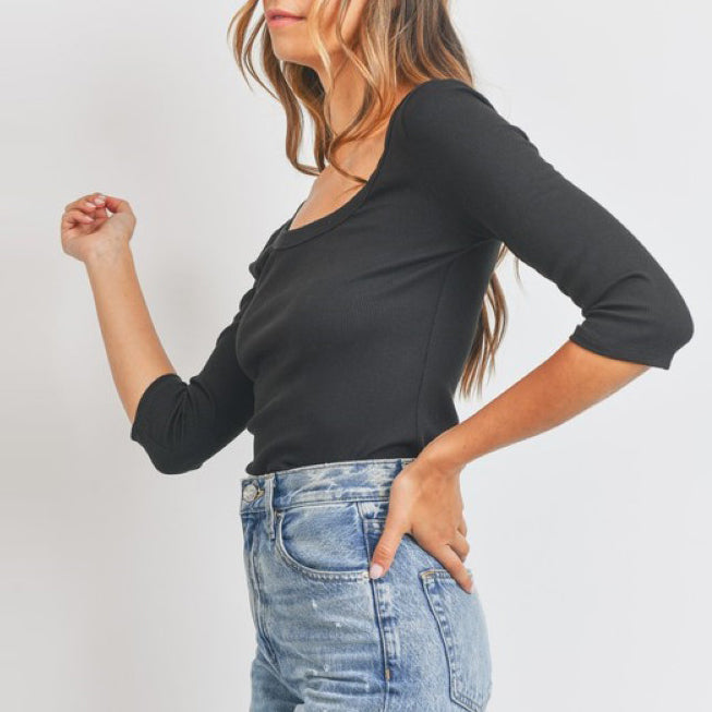 Scoop Neck. 3/4 Sleeve. Slim Fit. Stretchy Material. Ribbed Knit.