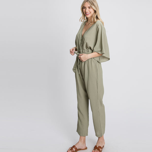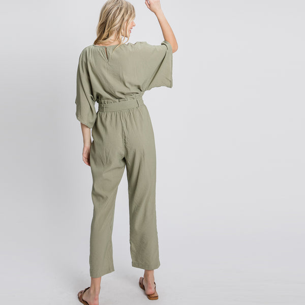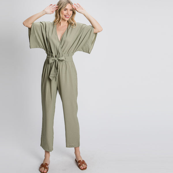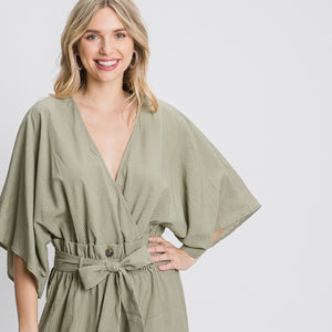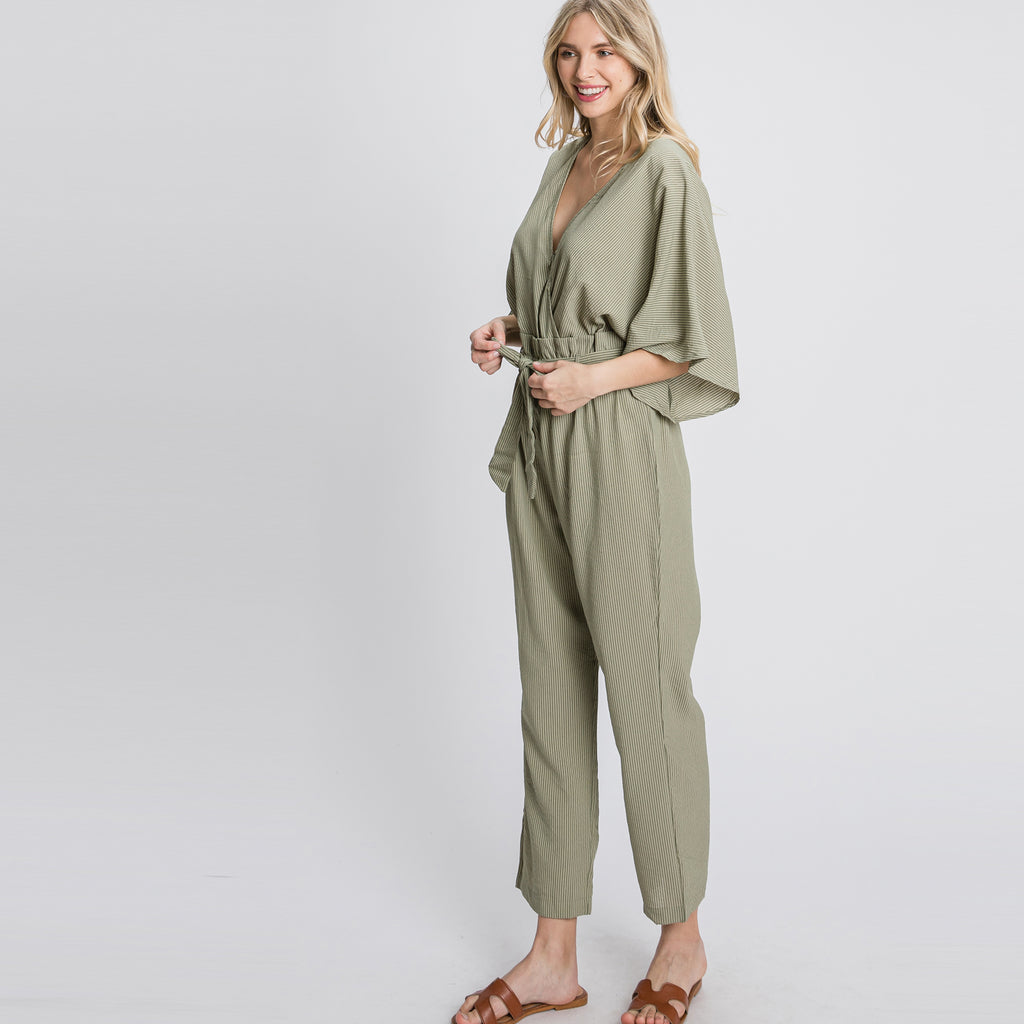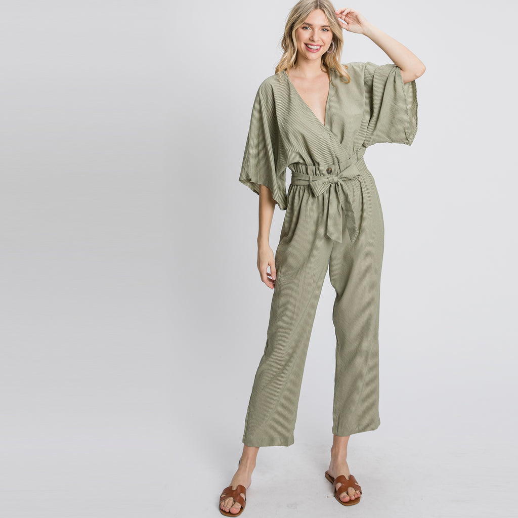 Our Sunkissed Kimono Jumpsuit is the perfect casual outfit for the upcoming season! This Kimono Jumpsuit features a slightly textures fabric with pinstripes throughout the bodice, comfortable kimono sleeves, paper bag pants, and adjustable V-neckline. Hurry this is a must-have addition to your wardrobe this season!