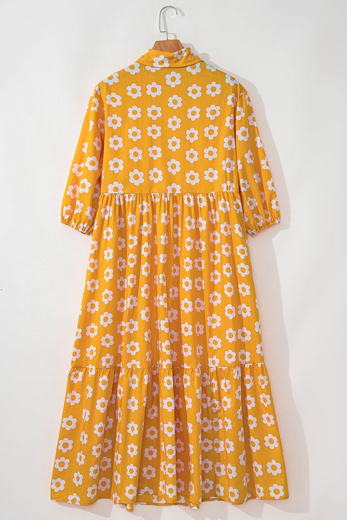 Bask in golden-hour glow with this cheerful mustard-yellow midi dress scattered with crisp white daisies. Classic collared neckline, button-front closure, smocked empire waist, long puff sleeves with elastic cuffs, and double-tiered ruffled skirt create effortless romance and flow. Lightweight, breathable fabric perfect for sunny days, vacations, or casual elegance. Material: 100% Cotton