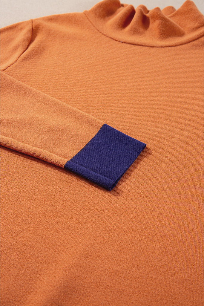 Step into effortless style with the Sunset Edge Sweater, a modern take on classic knitwear. Featuring a rich burnt orange body with bold cobalt trim, this sweater adds instant vibrance to your wardrobe. The mock neck design brings a polished edge while keeping you warm and comfortable through cooler days.