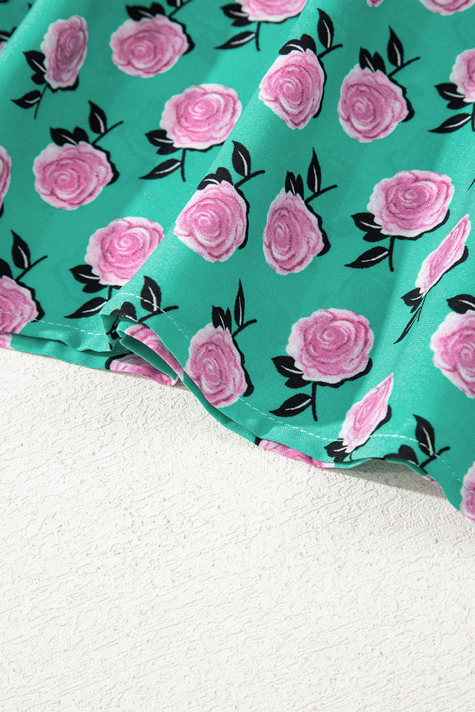 Float through the day in this enchanting teal maxi dress scattered with delicate hand-painted pink roses. Soft V-neck with tie-front closure, romantic bishop sleeves, double-tiered skirt, and ruffled hem create effortless flow and feminine charm. Lightweight, breezy fabric perfect for warm days, vacations, garden parties, or casual elegance. Material: 100% Polyester
