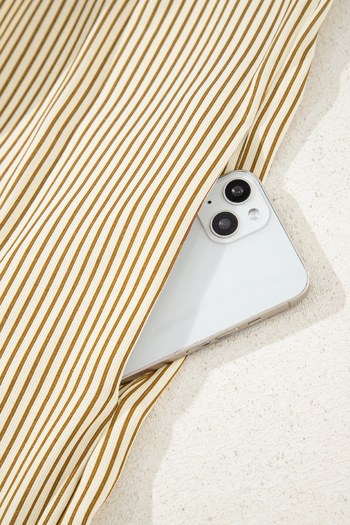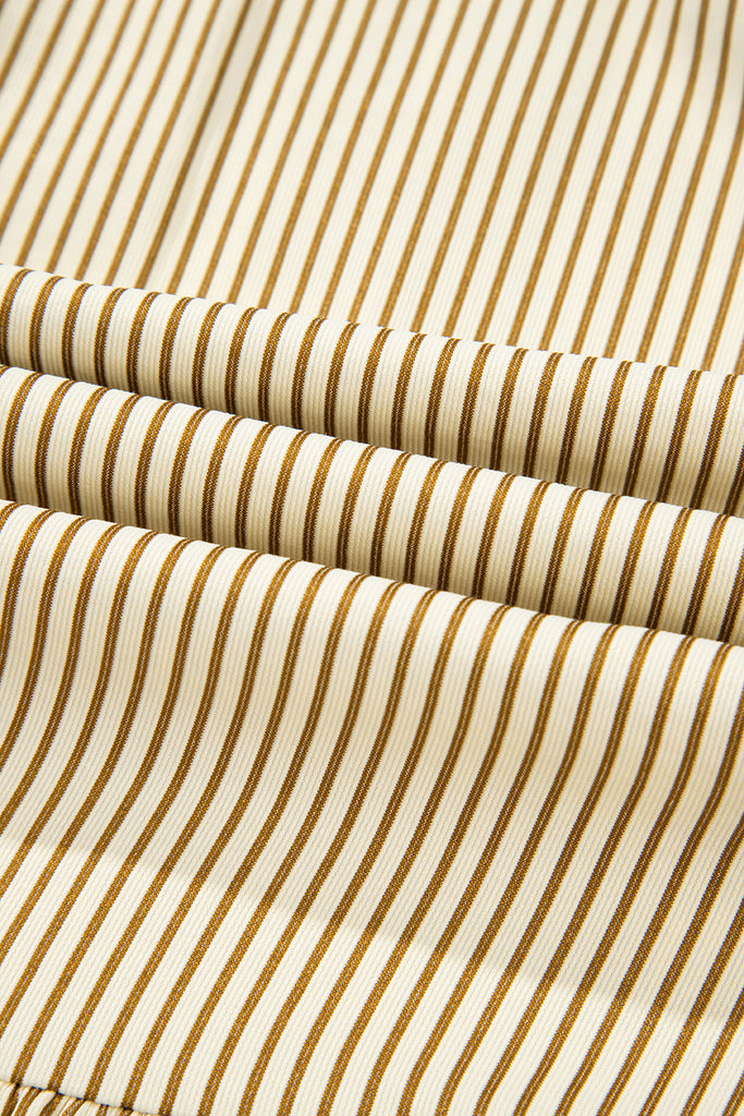 Relaxed babydoll mini dress in warm toffee beige and chocolate pinstripes. Features a classic collared neckline with dramatic yoke detail, full button-front closure, voluminous long bishop sleeves with button cuffs, side pockets, and a double-tier ruffled hem for playful movement. Oversized fit with breezy silhouette. Perfect for casual days, office-to-weekend styling, or layering with boots for effortless fall chic. Material: 50% Polyester, 50% Cotton. Imported.